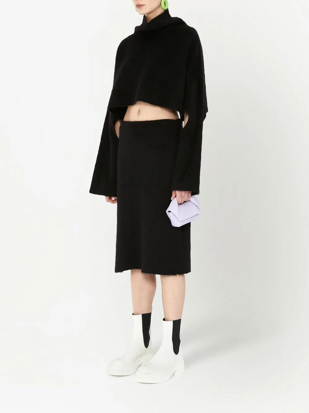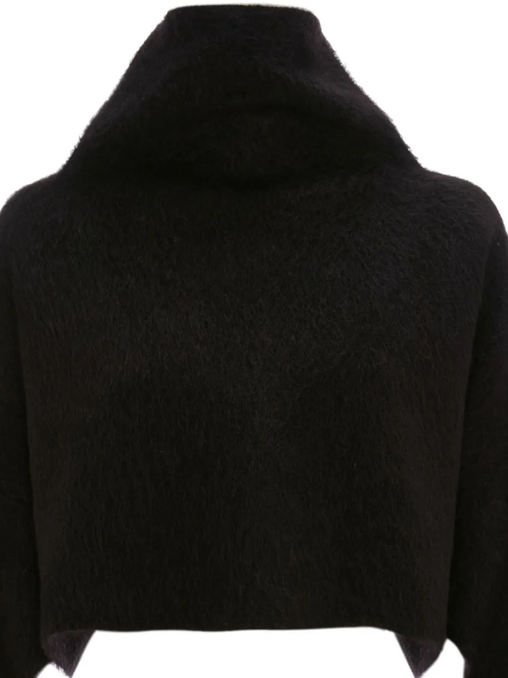Черный, смесь шерсти и мохера, воротник-труба, приспущенные плечи, длинные широкие рукава, вырезные детали, укороченная длина и нашивка с логотипом сзади.