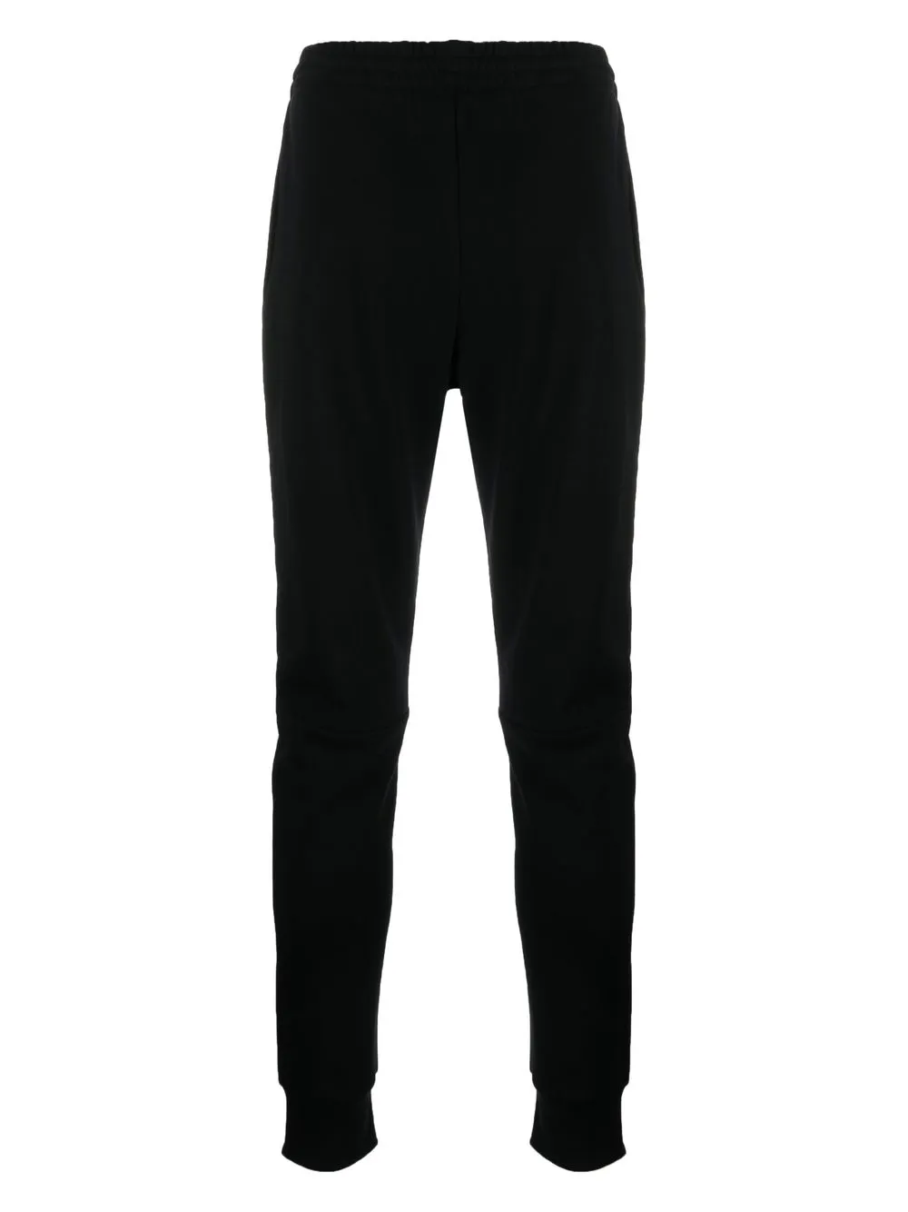 Черный, смесовый хлопок, узкий крой, средняя посадка, эластичный пояс, эластичные манжеты и прорезные карманы по бокам.