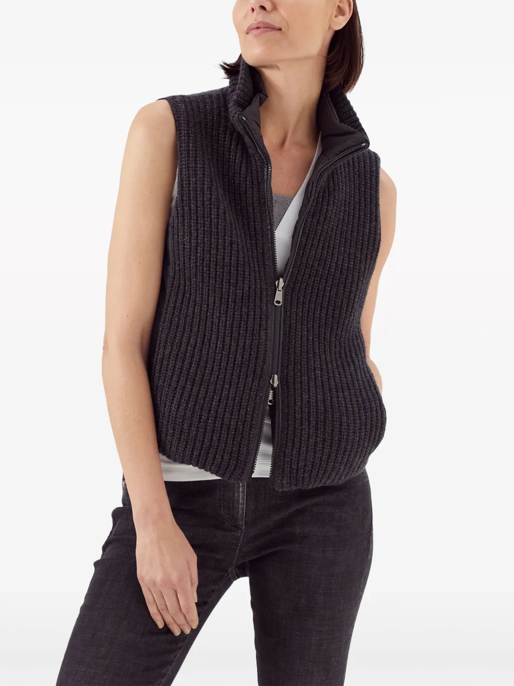 Антрацитово-серый, черный, кашемир, сочетание двух оттенков, застежка на молнии спереди и высокий воротник.