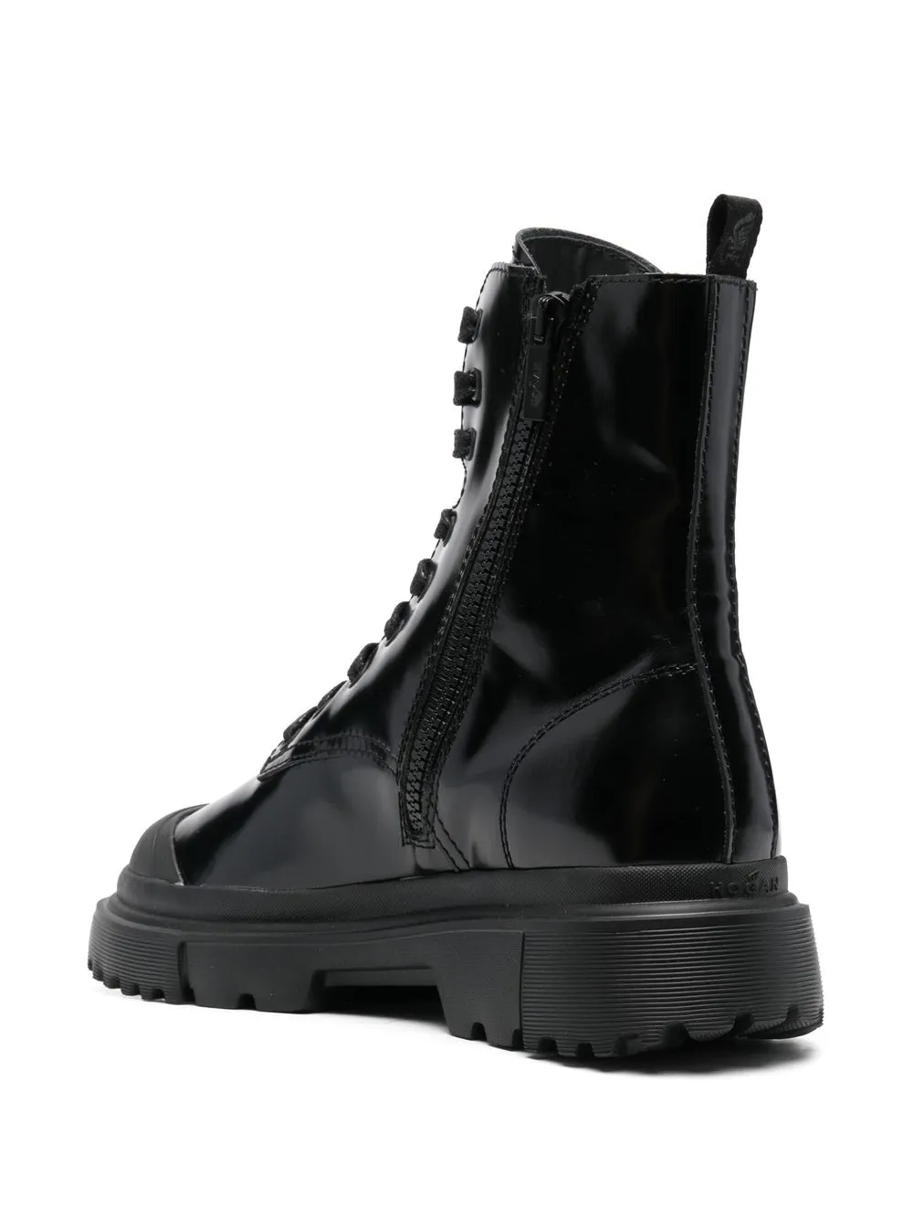 Черный, телячья кожа, глянцевый эффект, контрастный носок, тисненый логотип на язычке, закругленный носок, шнуровка спереди, застежка на молнии сбоку, петля для подтягивания сзади, строчка в тон, высота по щиколотку, рифленая резиновая подошва и низкий каблук.