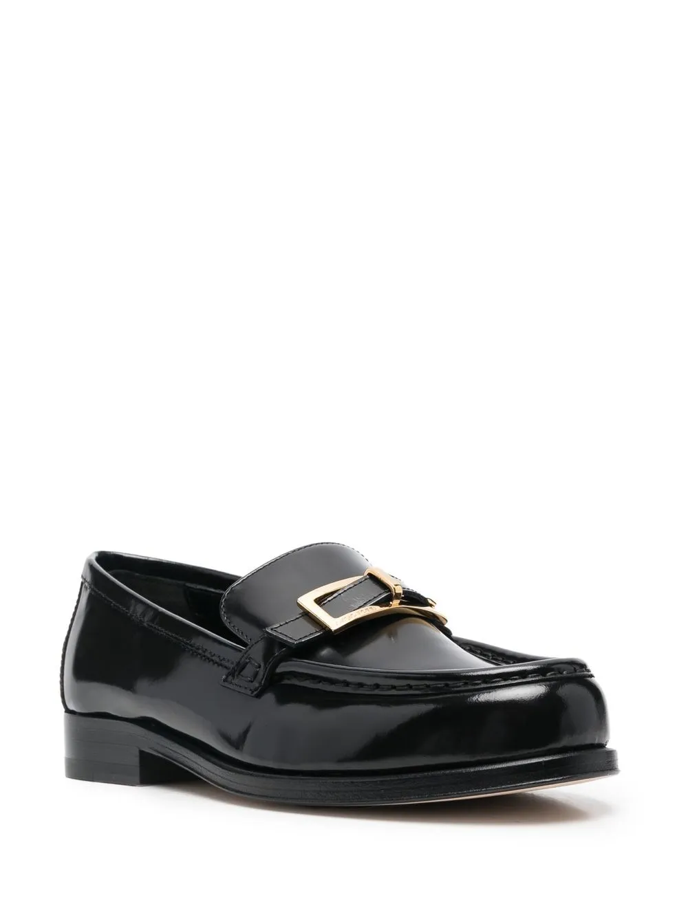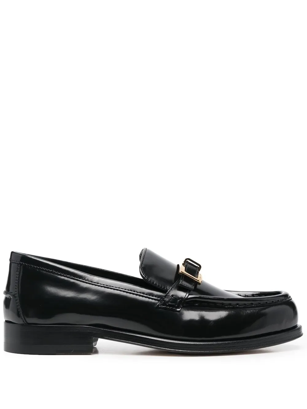 Черный, телячья кожа, пряжка с логотипом, золотистая фурнитура, глянцевый эффект, миндалевидный носок, кожаная стелька с логотипом, модель без застежки и низкий блочный каблук.