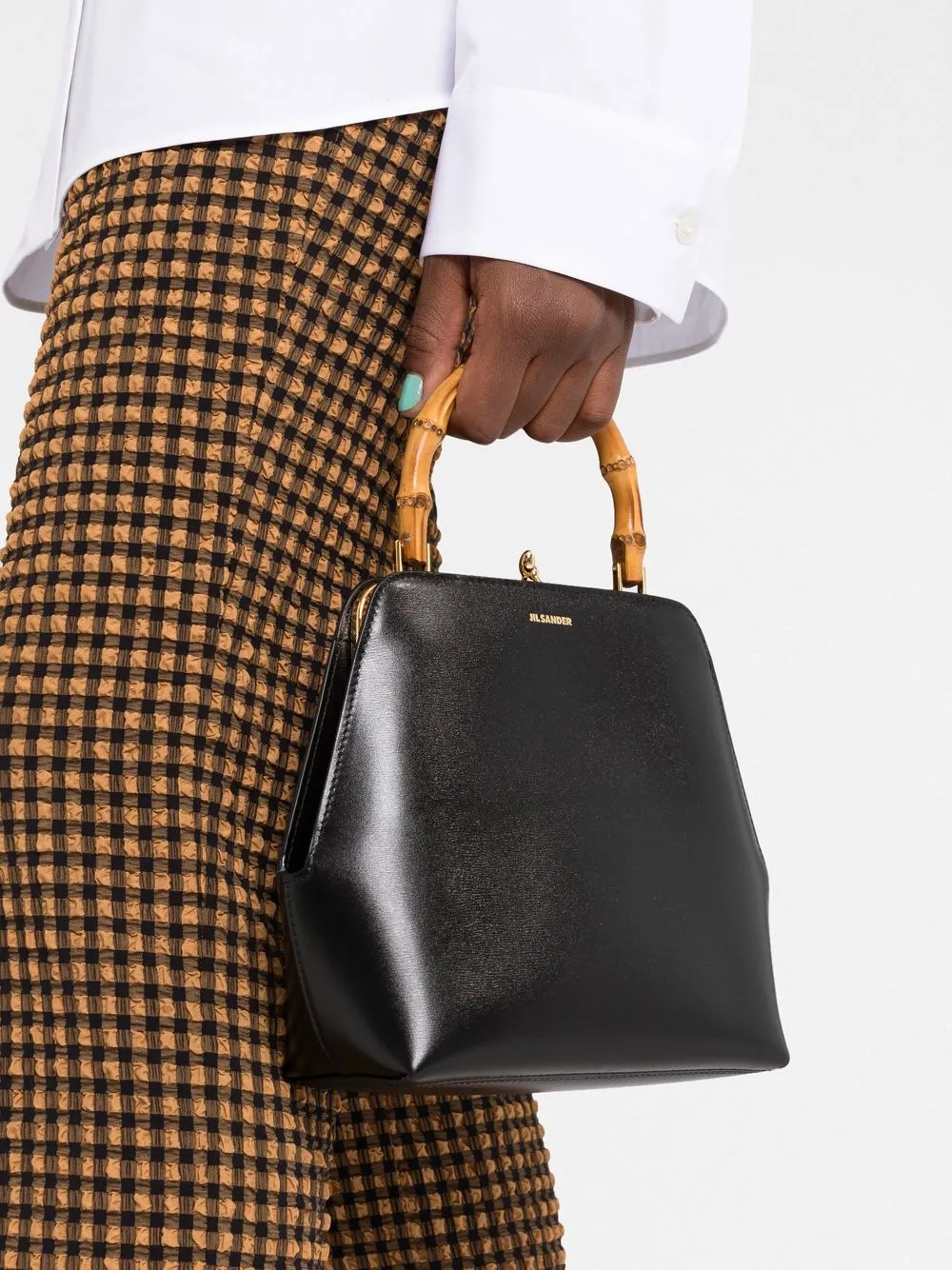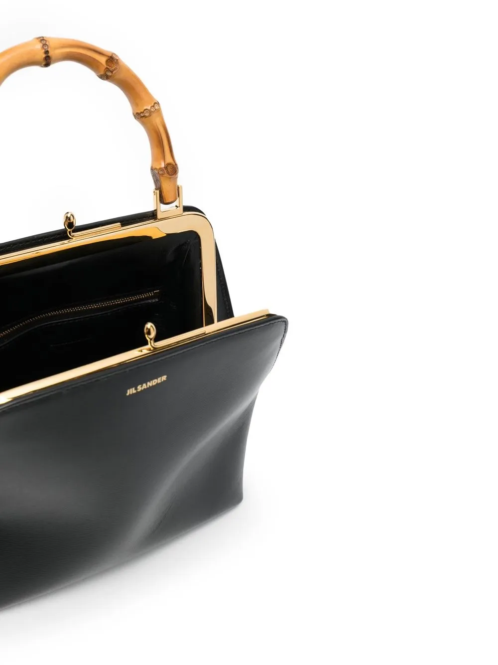 Черный, телячья кожа, тисненый логотип спереди, короткая ручка из бамбука, золотистая фурнитура, застежка на зажиме, основное отделение, внутренний карман на молнии и нашивка с логотипом внутри.
