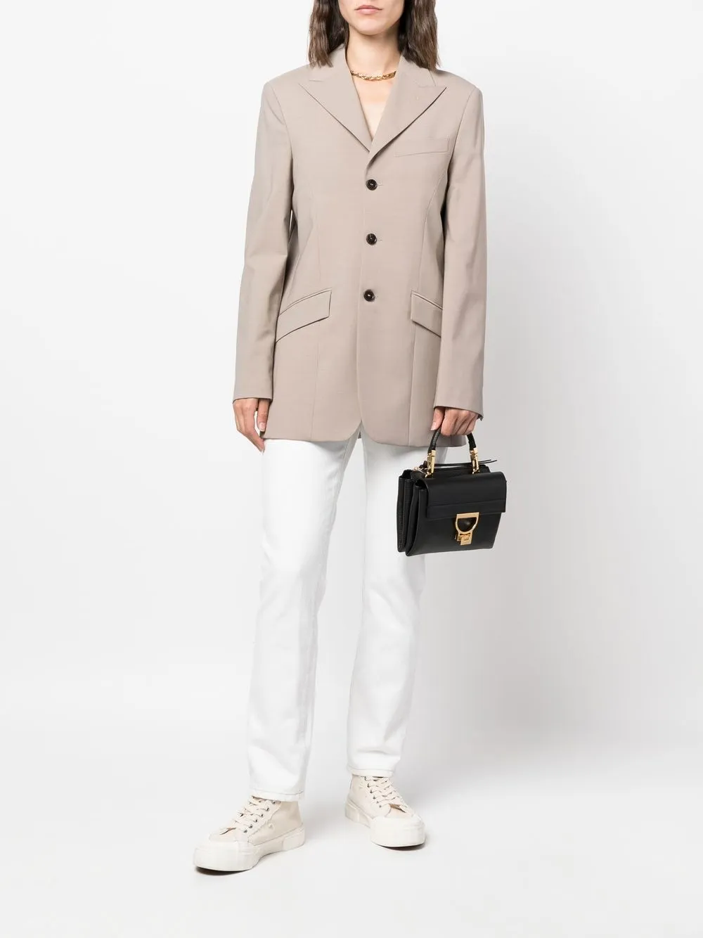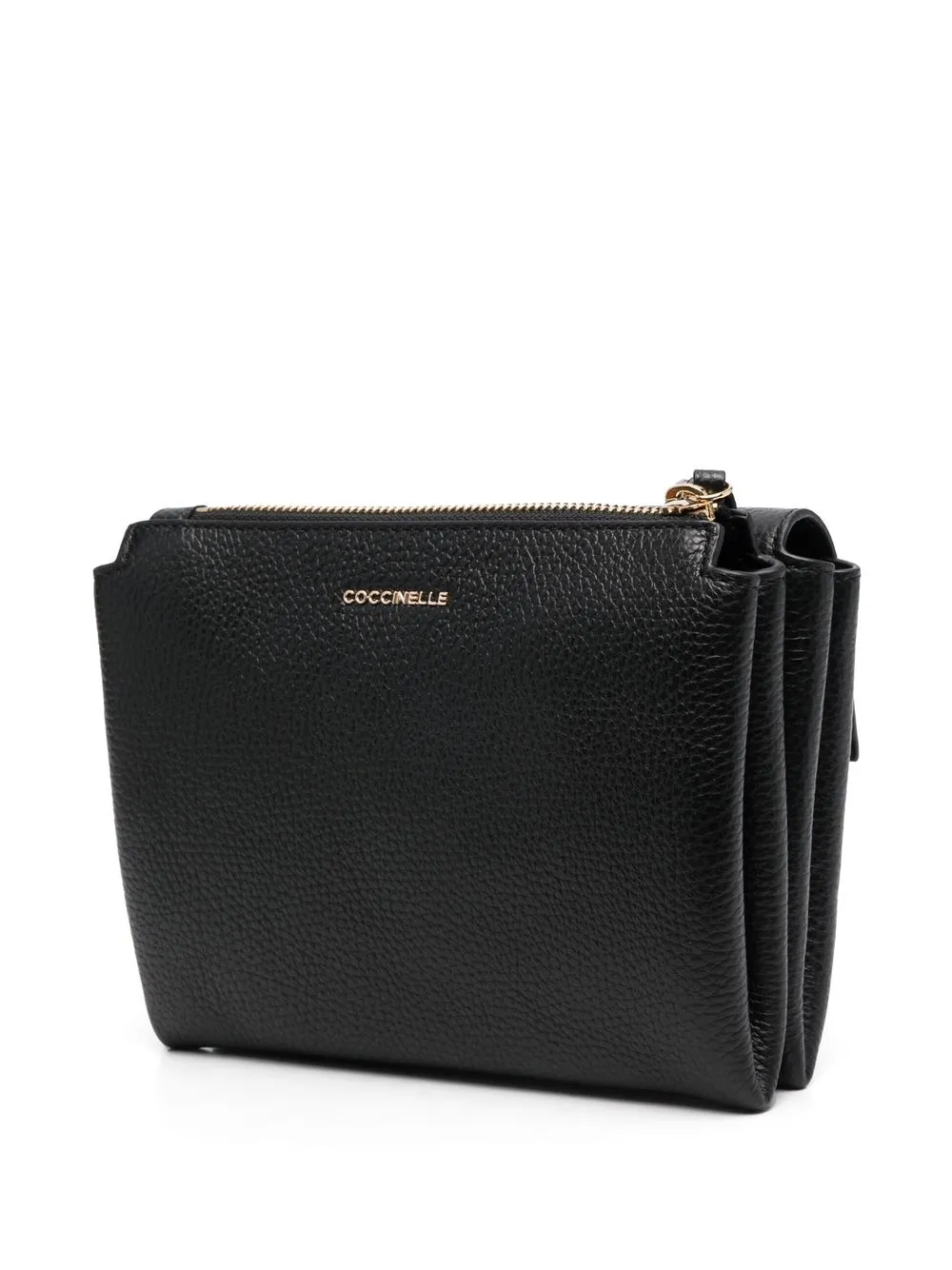 Черный, кожа, зернистая текстура, юбка со встречной складкой, золотистая фурнитура, застежка на зажиме и закругленная верхняя ручка.