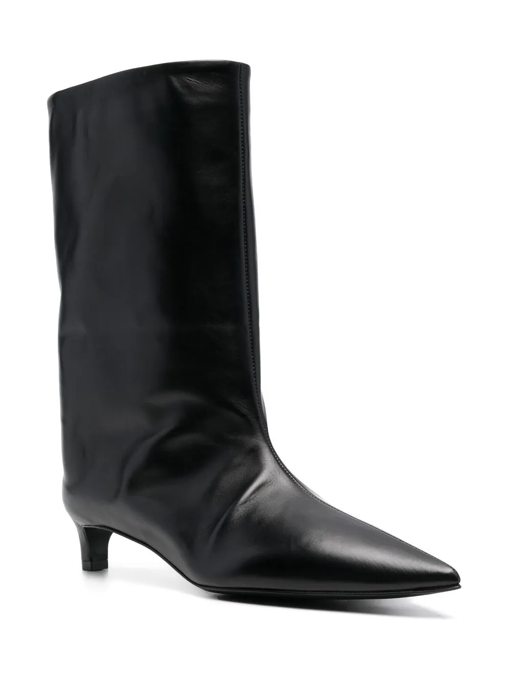 Черный, телячья кожа, модель без застежки, высота по щиколотку, низкий каблук, кожаная стелька с логотипом и кожаная подошва.