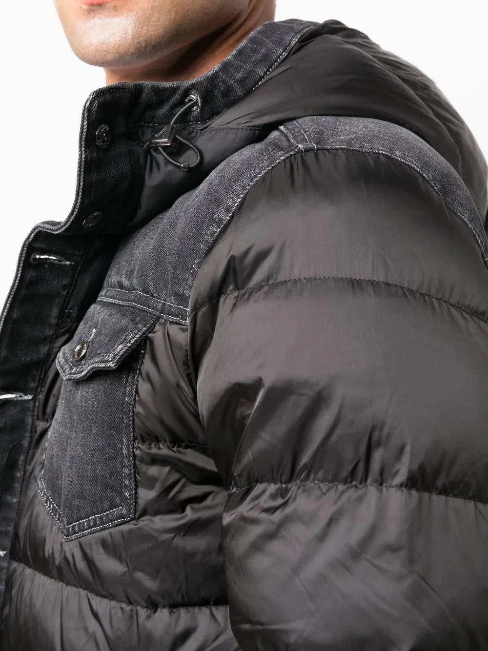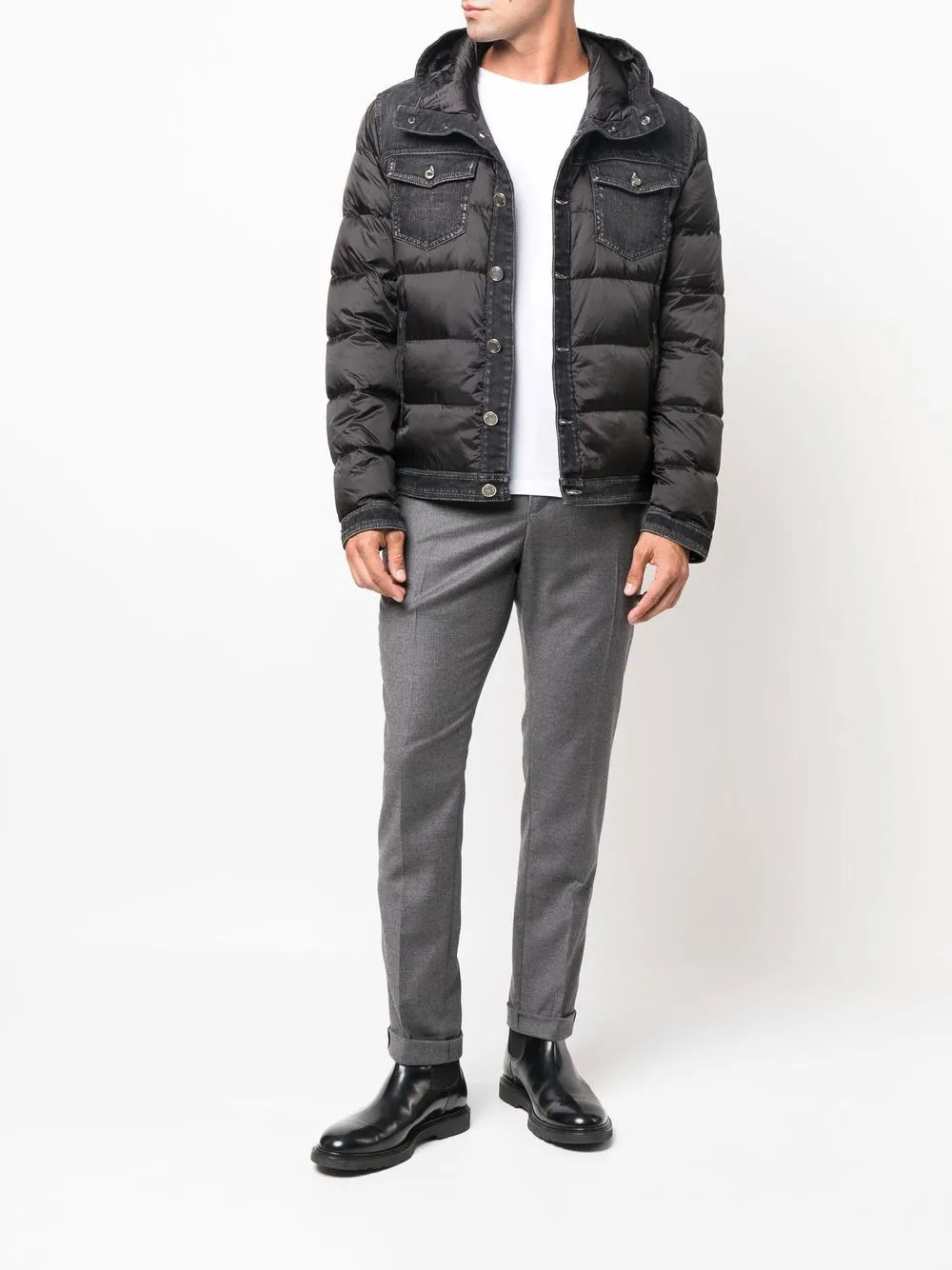 Черный, смесовый хлопок, наполнитель из смеси пуха и пера, дутый материал, стеганая модель, классический воротник, застежка на пуговицах спереди, длинные рукава, два нагрудных кармана с клапанами, два кармана на молнии по бокам и прямой подол.