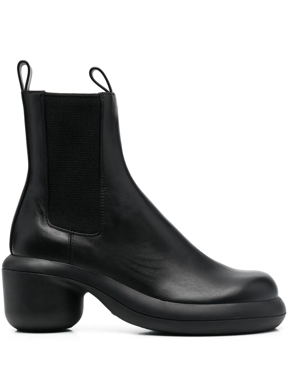 Черный, телячья кожа, эластичные боковые вставки, двойная петля для подтягивания, закругленный носок, модель без застежки, стелька с логотипом, каблук средней высоты и массивная резиновая подошва.