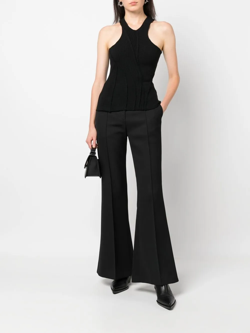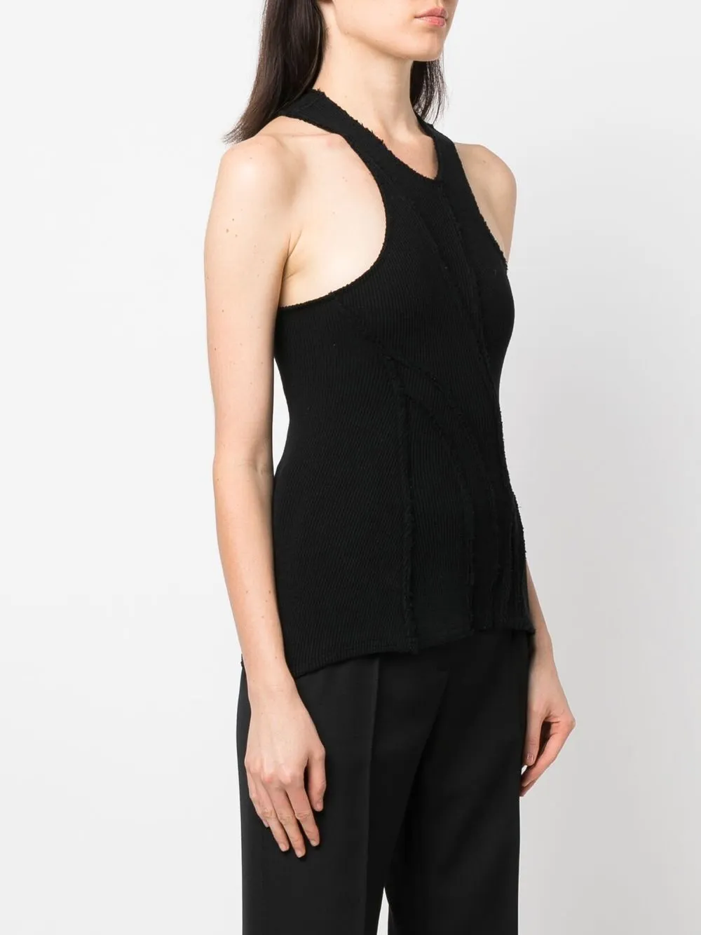 Черный, эластичный хлопок, трикотаж в рубчик, декоративные наружные швы, вырез-петля халтер, вырез рейсер, без рукавов и прямой подол.