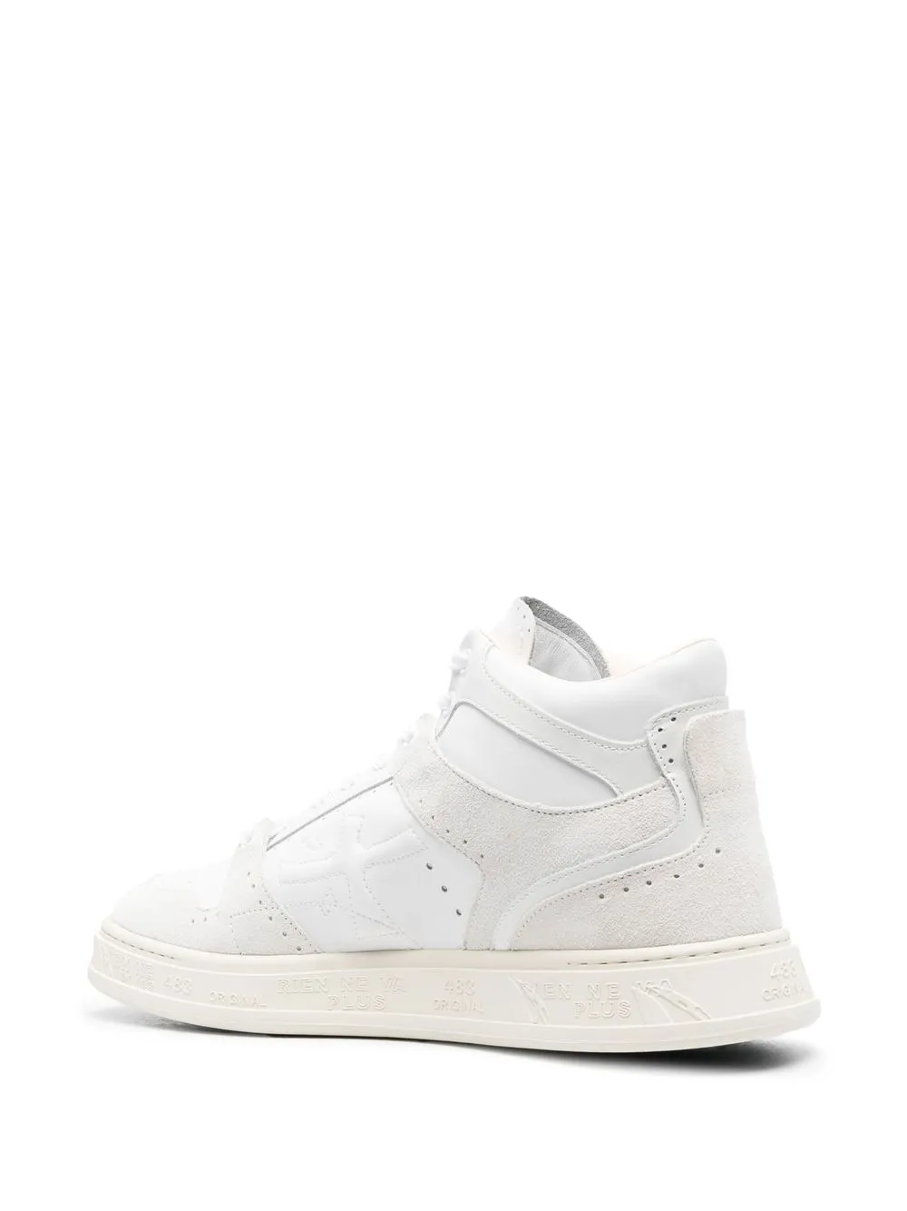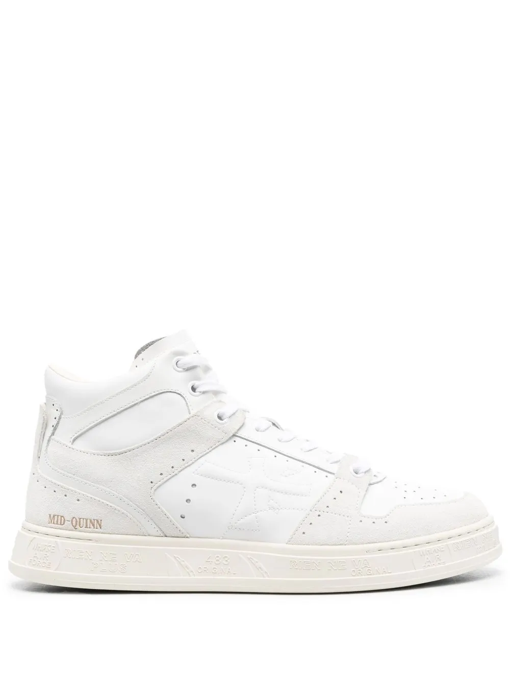 Белый, светло-серый, телячья кожа, высота по щиколотку, вставки, замшевые вставки, тисненый логотип сбоку, логотип сбоку, миндалевидный носок, шнуровка спереди, кожаная стелька с логотипом и плоская резиновая подошва.