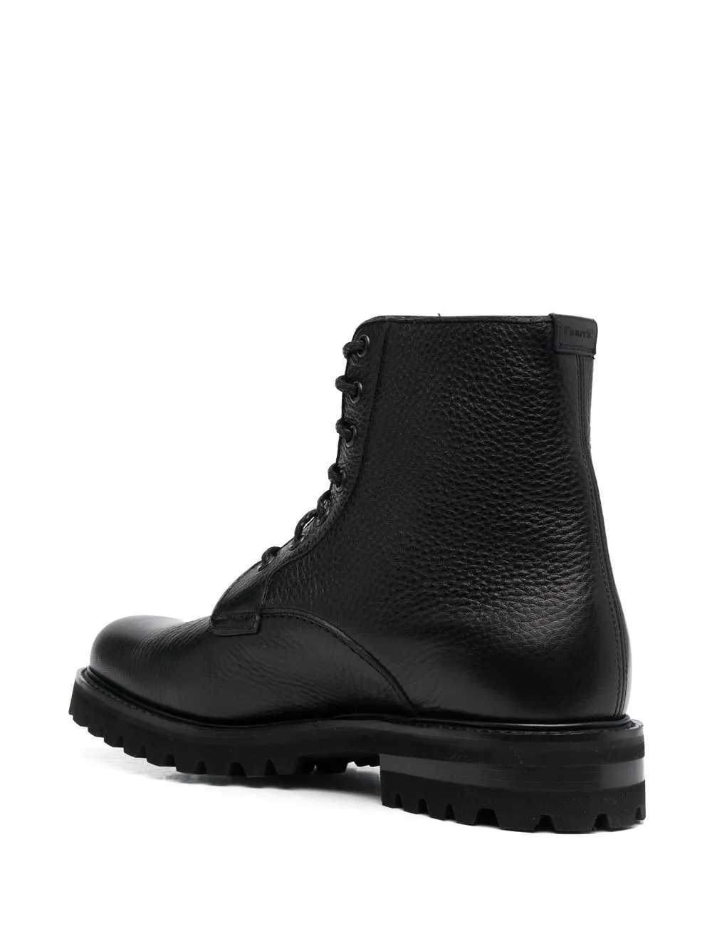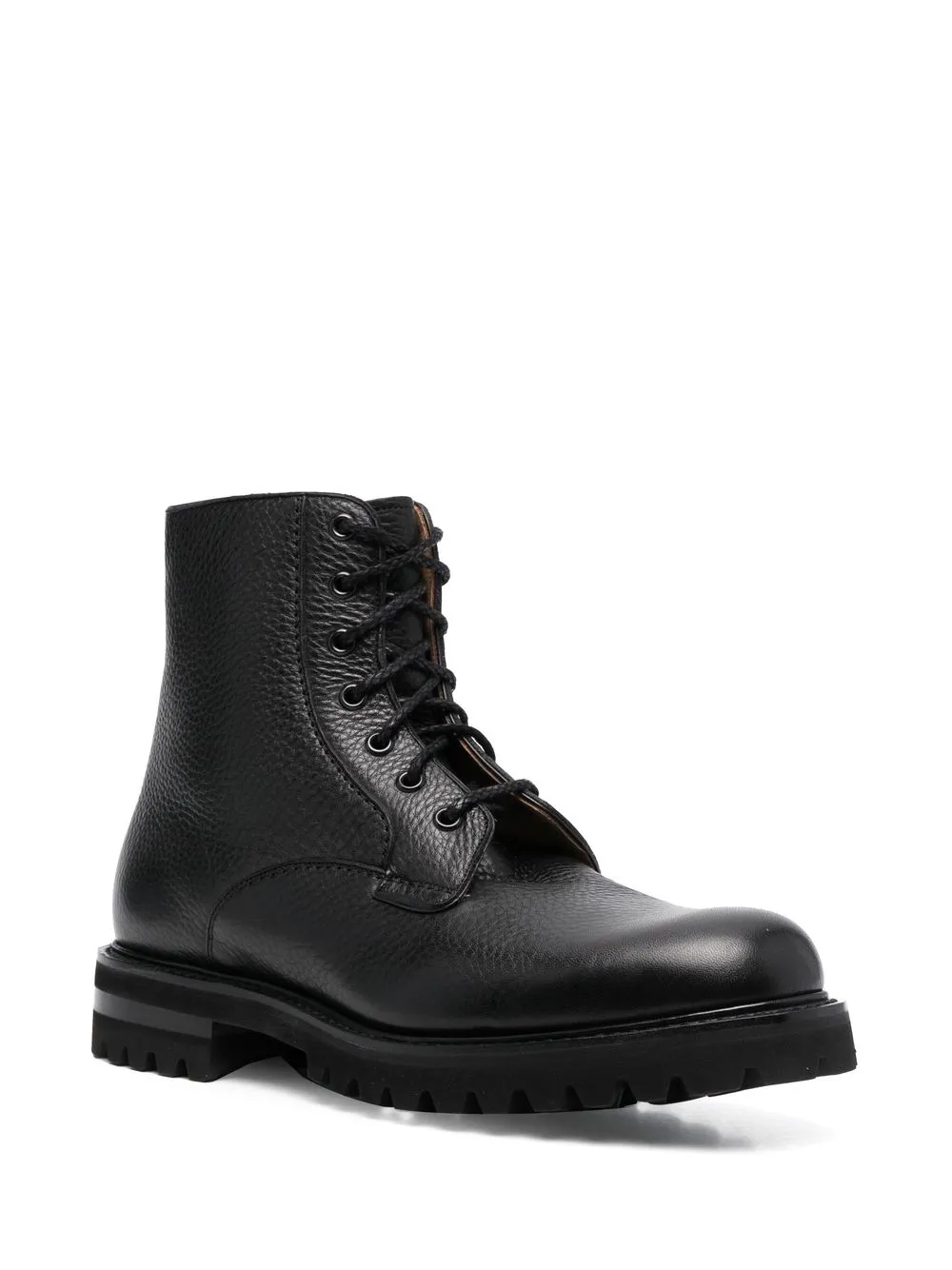 Черный, телячья кожа, высота по щиколотку, закругленный носок, шнуровка спереди и рифленая резиновая подошва.