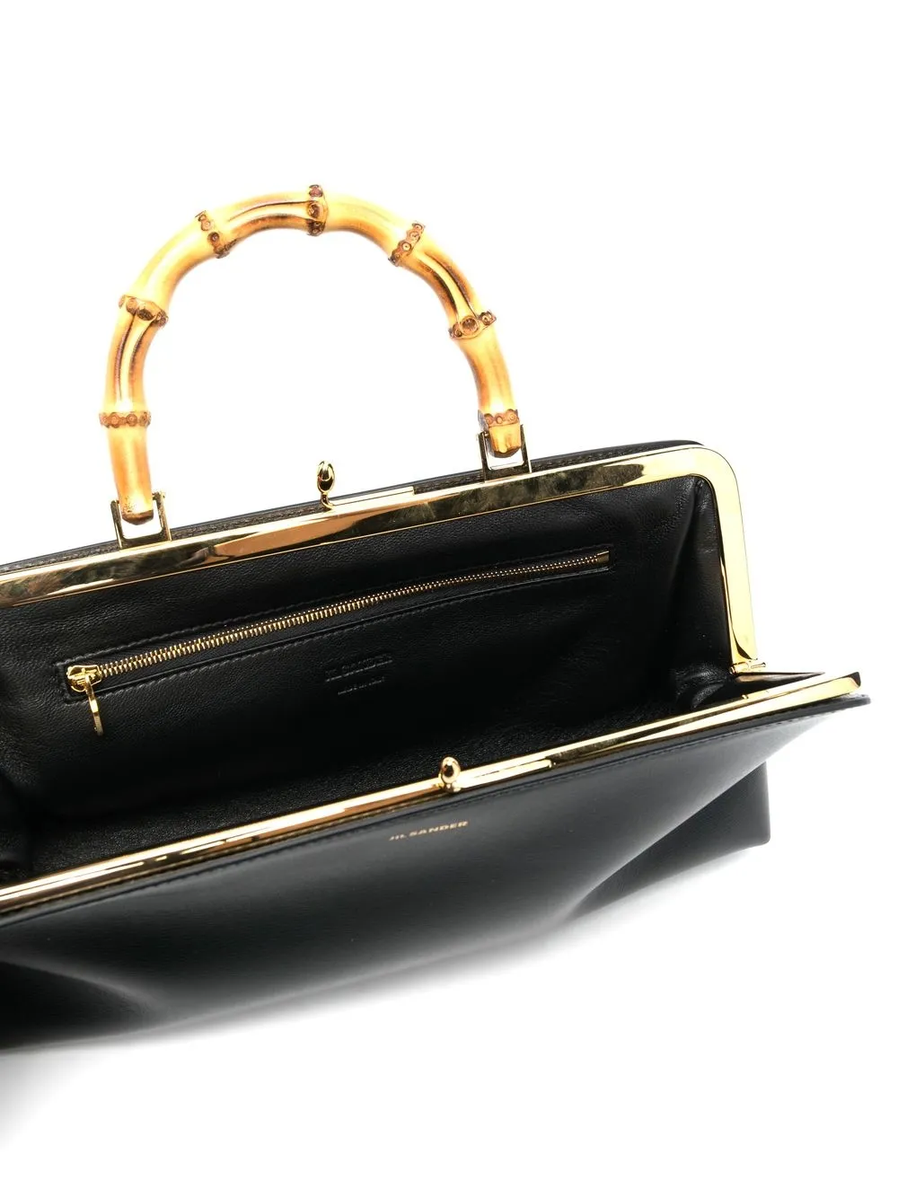 Черный, телячья кожа, короткая ручка из бамбука, золотистый логотип, золотистая фурнитура, застежка-защелка сверху, основное отделение и внутренний карман на молнии.