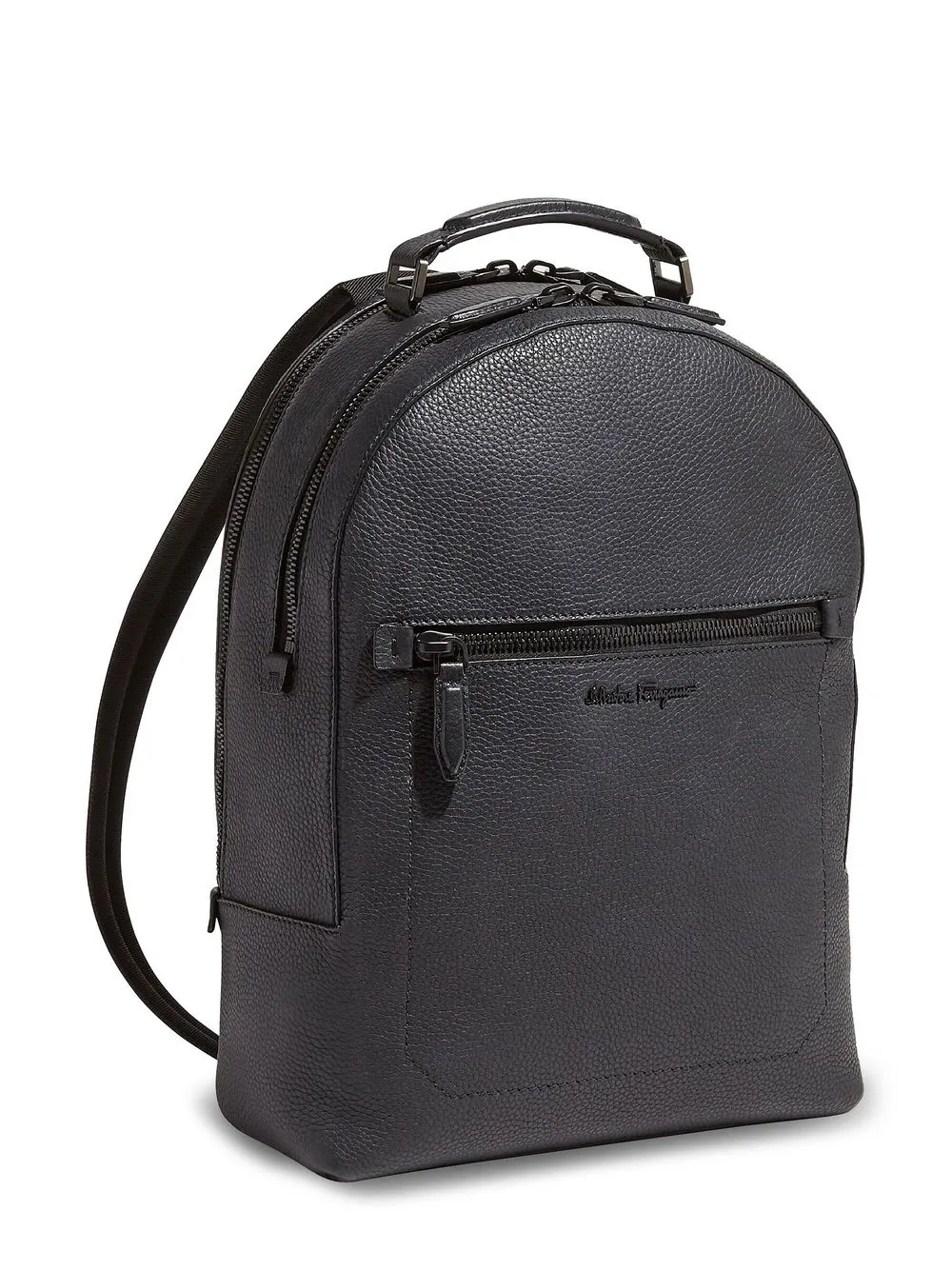 Черный, телячья кожа, зернистая текстура, логотип, ручка с плоским верхом, две регулируемые бретели, застежка на молнии сверху, основное отделение, внутренний карман на молнии и подкладка с логотипами.