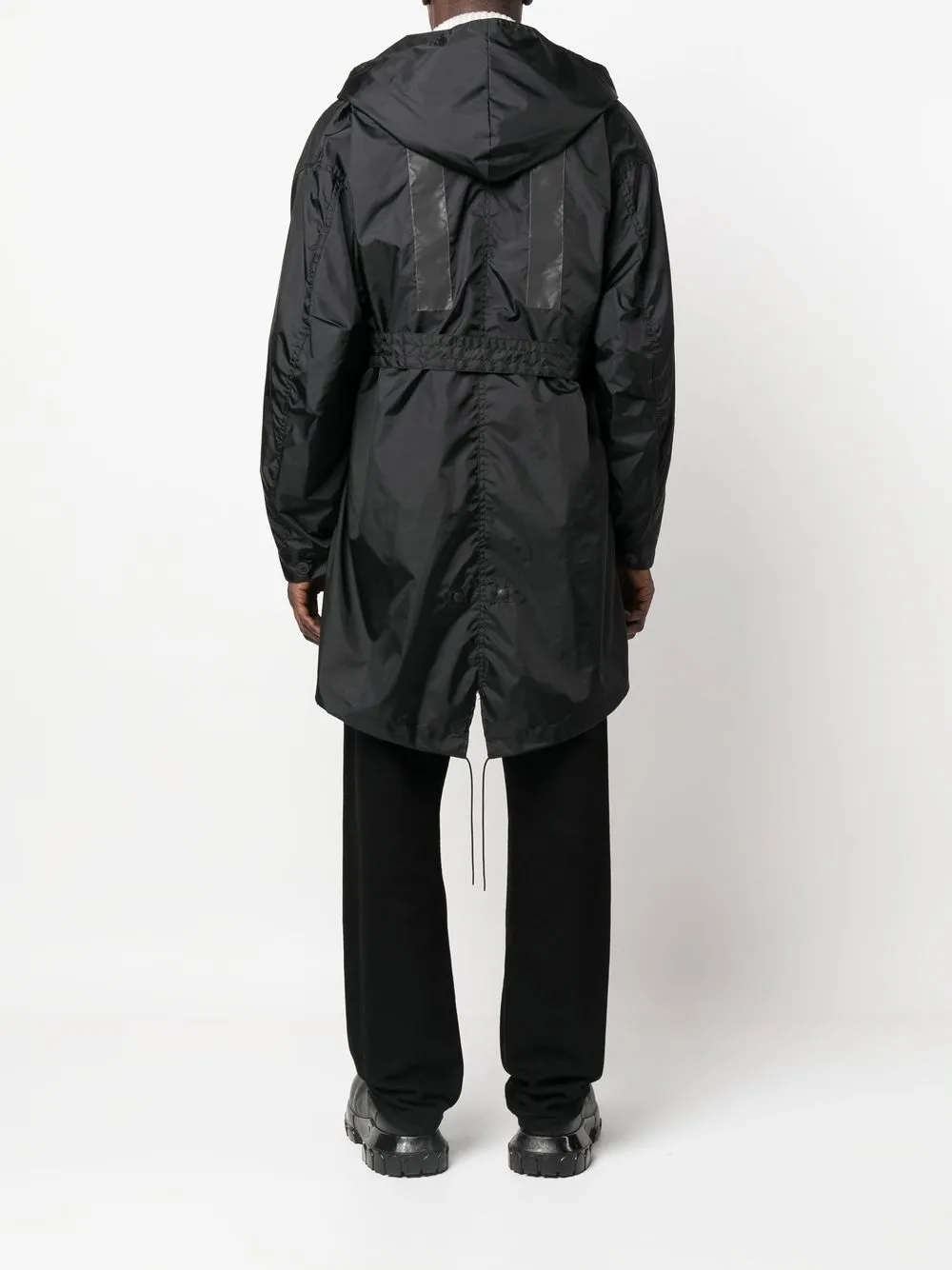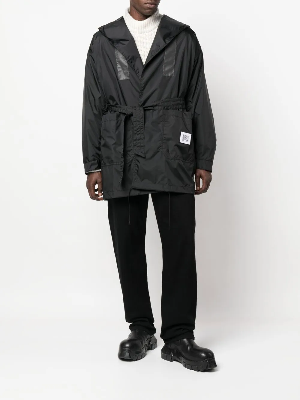 Черный, водонепроницаемый материал, нашивка с логотипом спереди, классический капюшон, классические лацканы, ремень на талии, два накладных кармана спереди, длинные рукава и прямой подол.