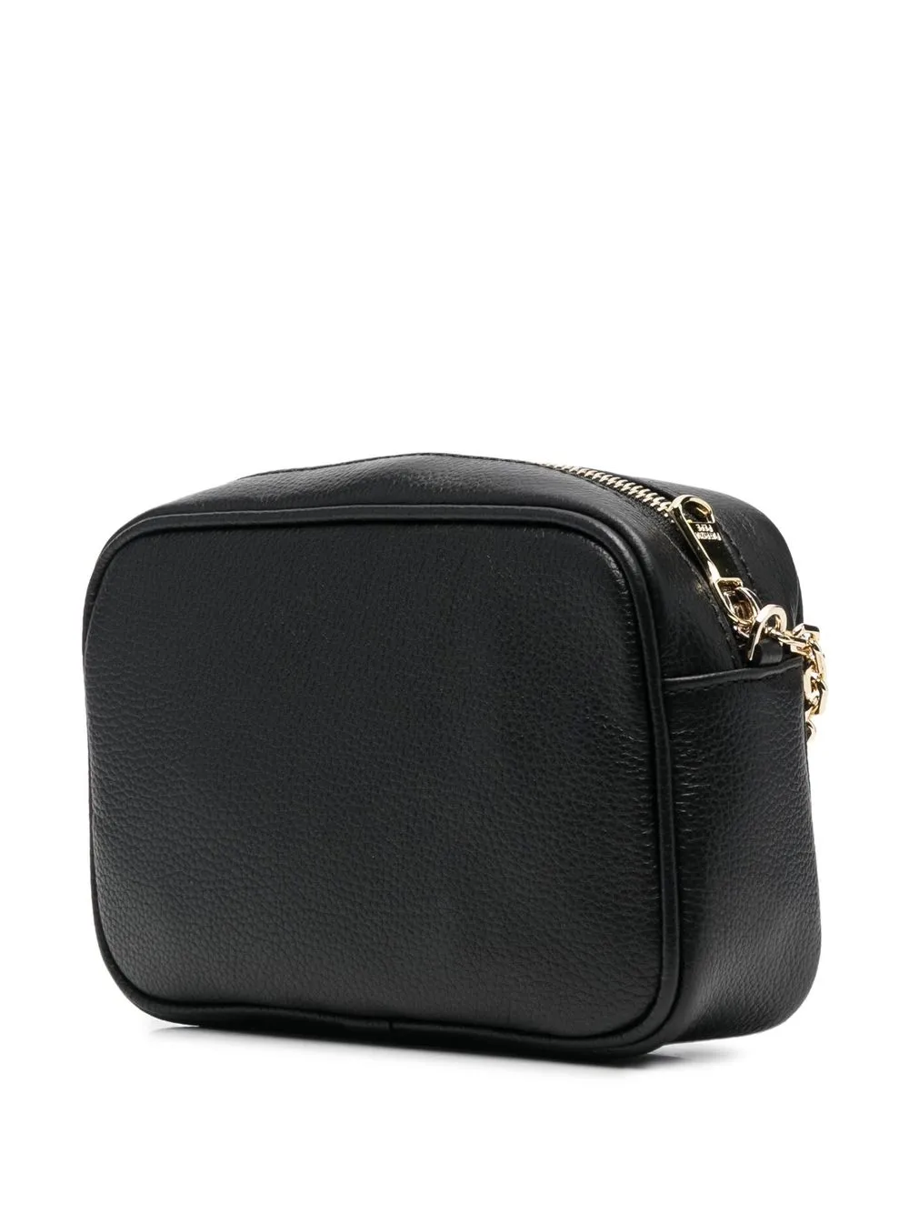 Черный, телячья кожа, зернистая текстура, золотистый металлический логотип, золотистая фурнитура, регулируемый ремень из кожи и металла на плечо, застежка на молнии сверху, основное отделение, нашивка с логотипом внутри и подкладка с логотипами.