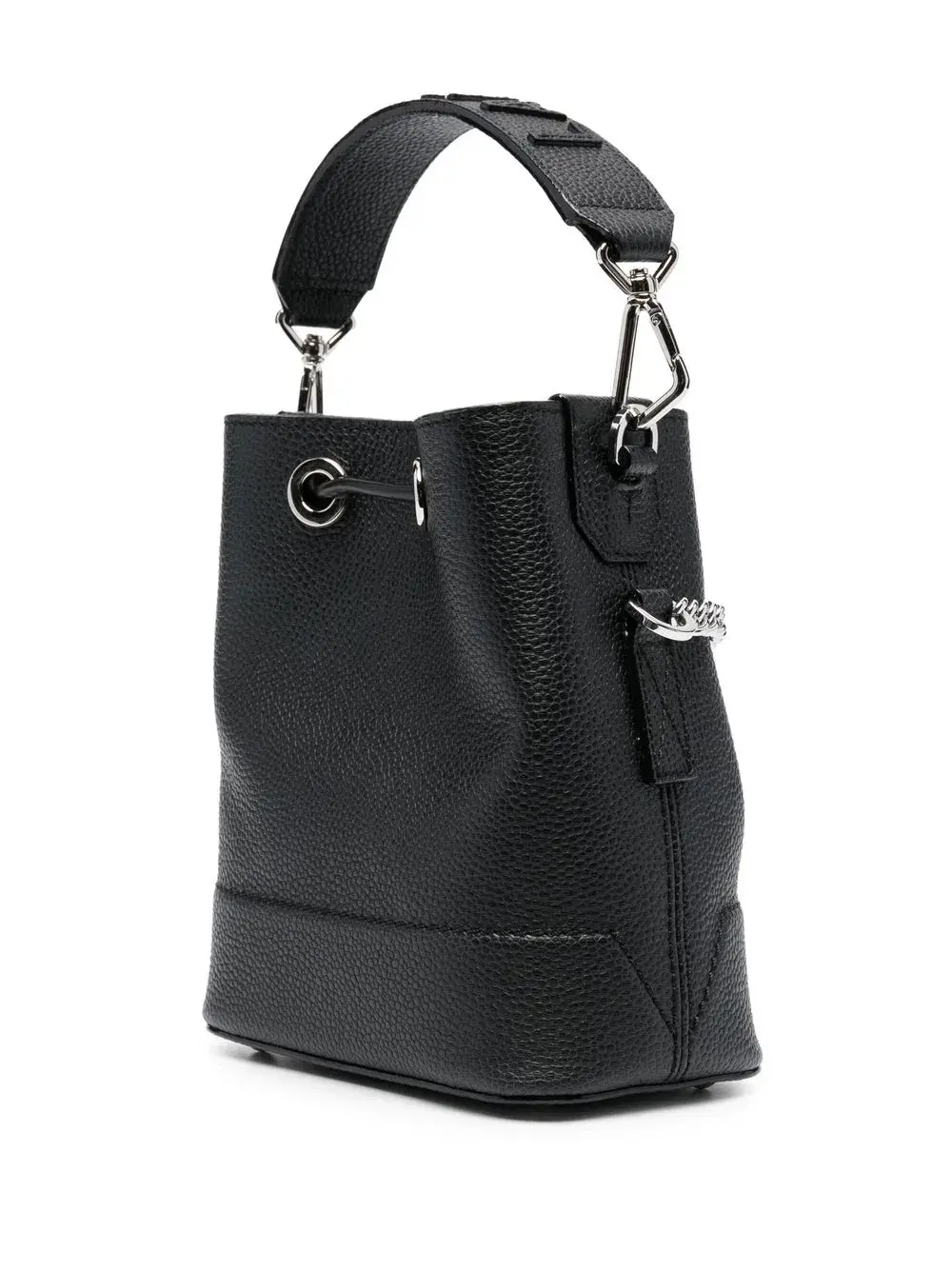 Черный, телячья кожа, хлопок, зернистая текстура, нашивка с логотипом спереди, логотип-аппликация, верхняя ручка, кулиска, ремень на плечо с цепочной деталью, кулиска, основное отделение, внутренний прорезной карман и нашивка с логотипом внутри.
