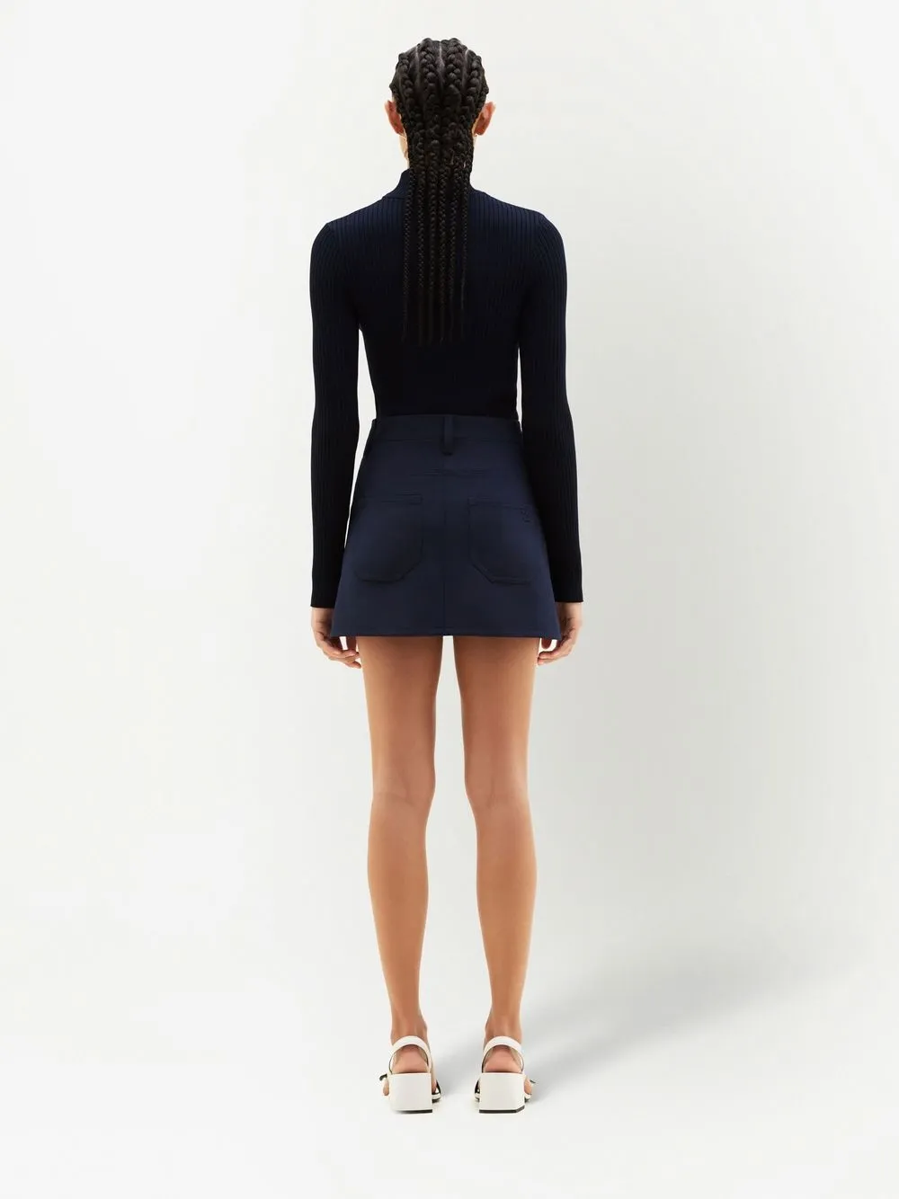 Темно-синий, смесовый хлопок, трикотаж в рубчик, вышитый логотип спереди, длинные рукава, высокий воротник и прямой подол.