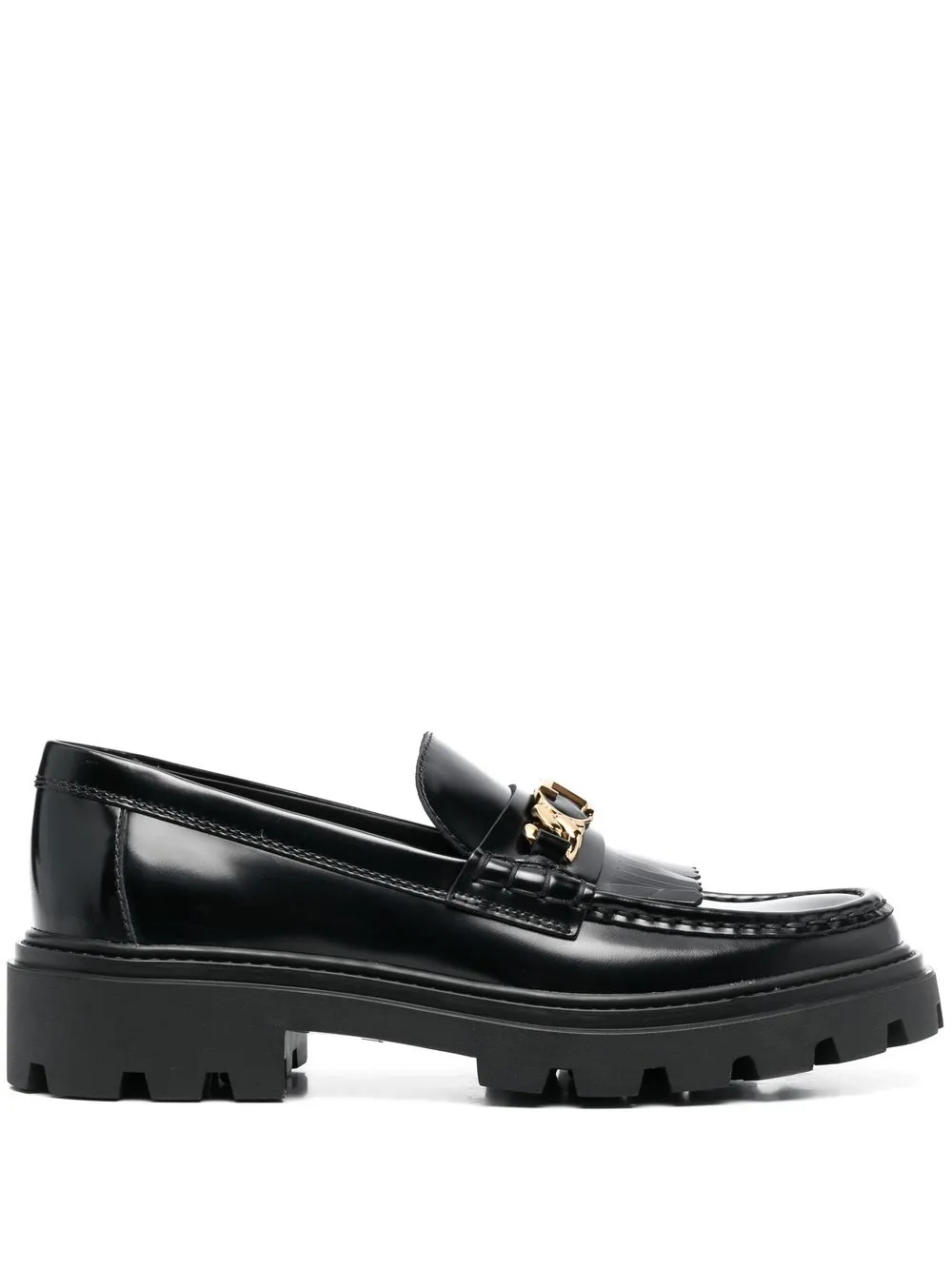 Черный, телячья кожа, золотистый металлический логотип, дизайн с бахромой, миндалевидный носок, стелька с логотипом и массивная резиновая подошва.