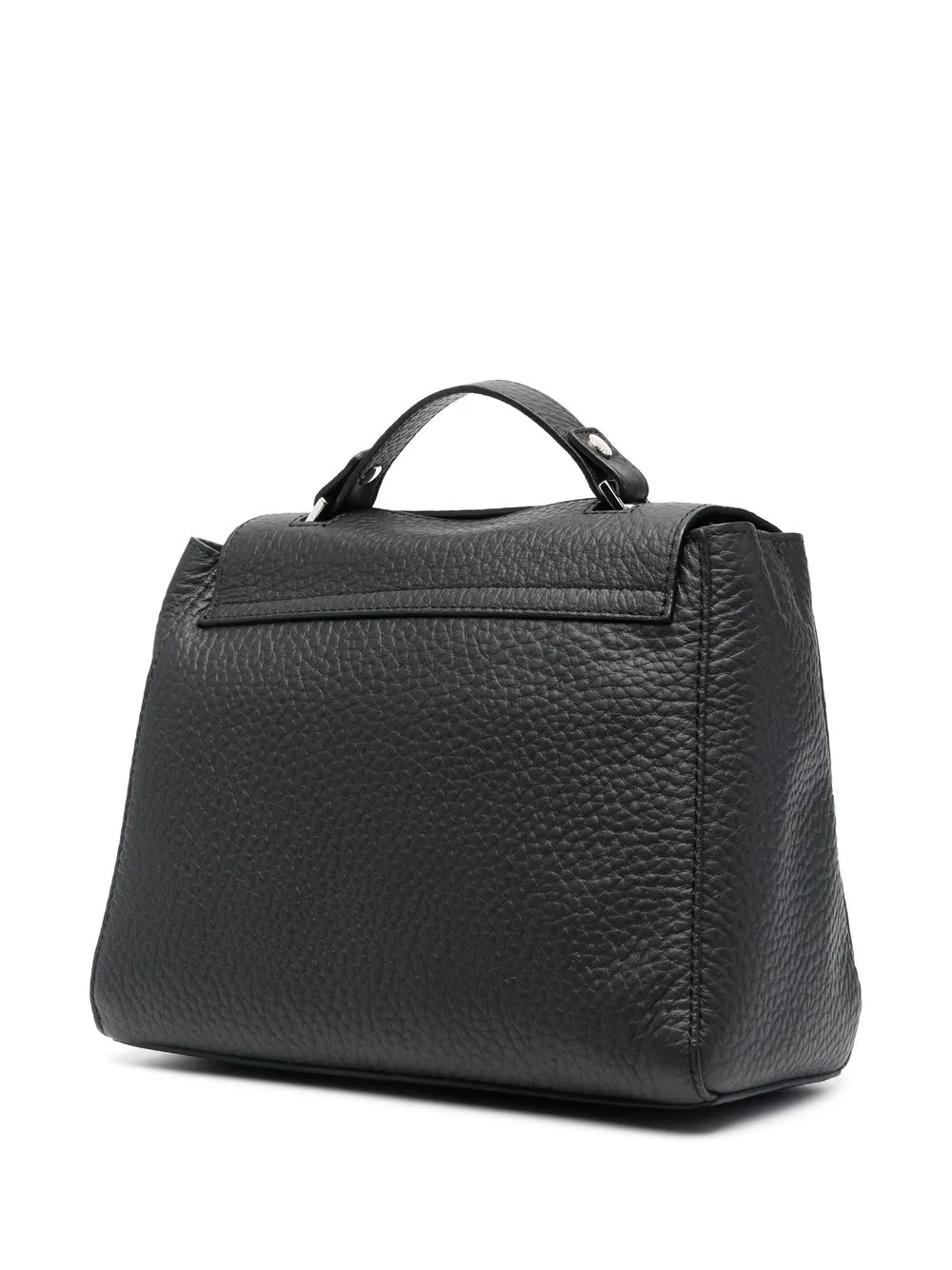 Черный, телячья кожа, зернистая текстура, серебристый логотип, ручка с плоским верхом, съемный регулируемый ремень на плечо, откидной клапан на магните, основное отделение и внутренний карман на молнии.