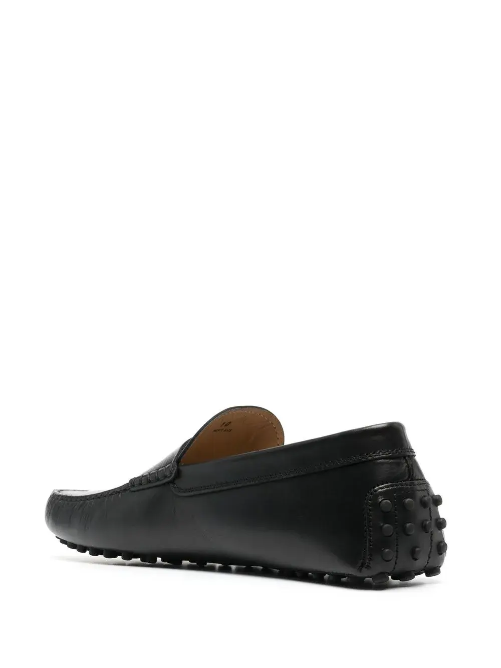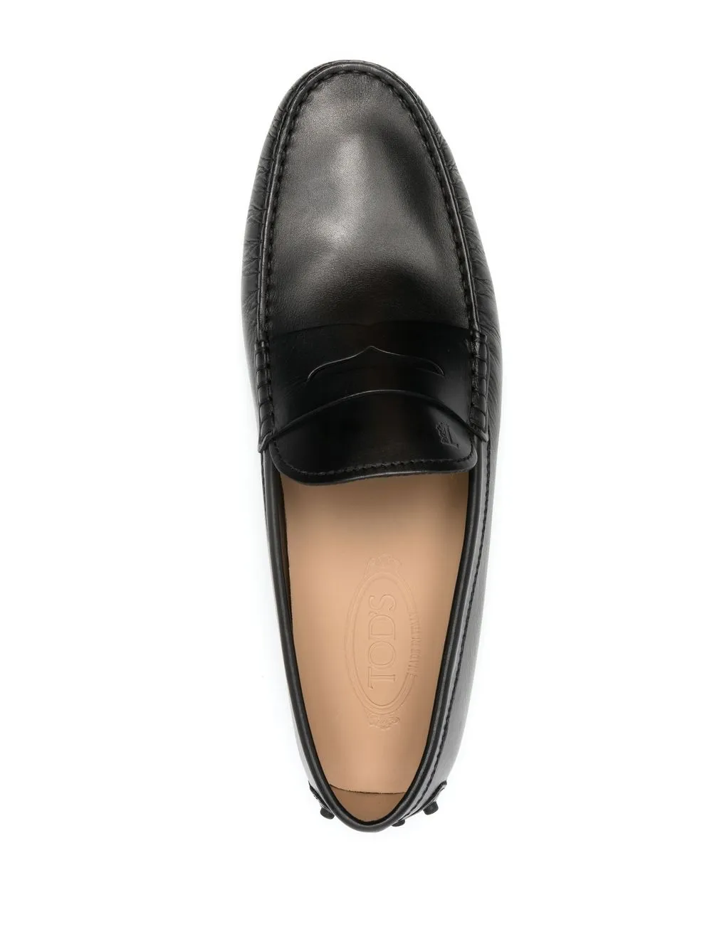 Черный, телячья кожа, тисненый логотип спереди, миндалевидный носок, модель без застежки, стелька с логотипом и резиновая подошва.