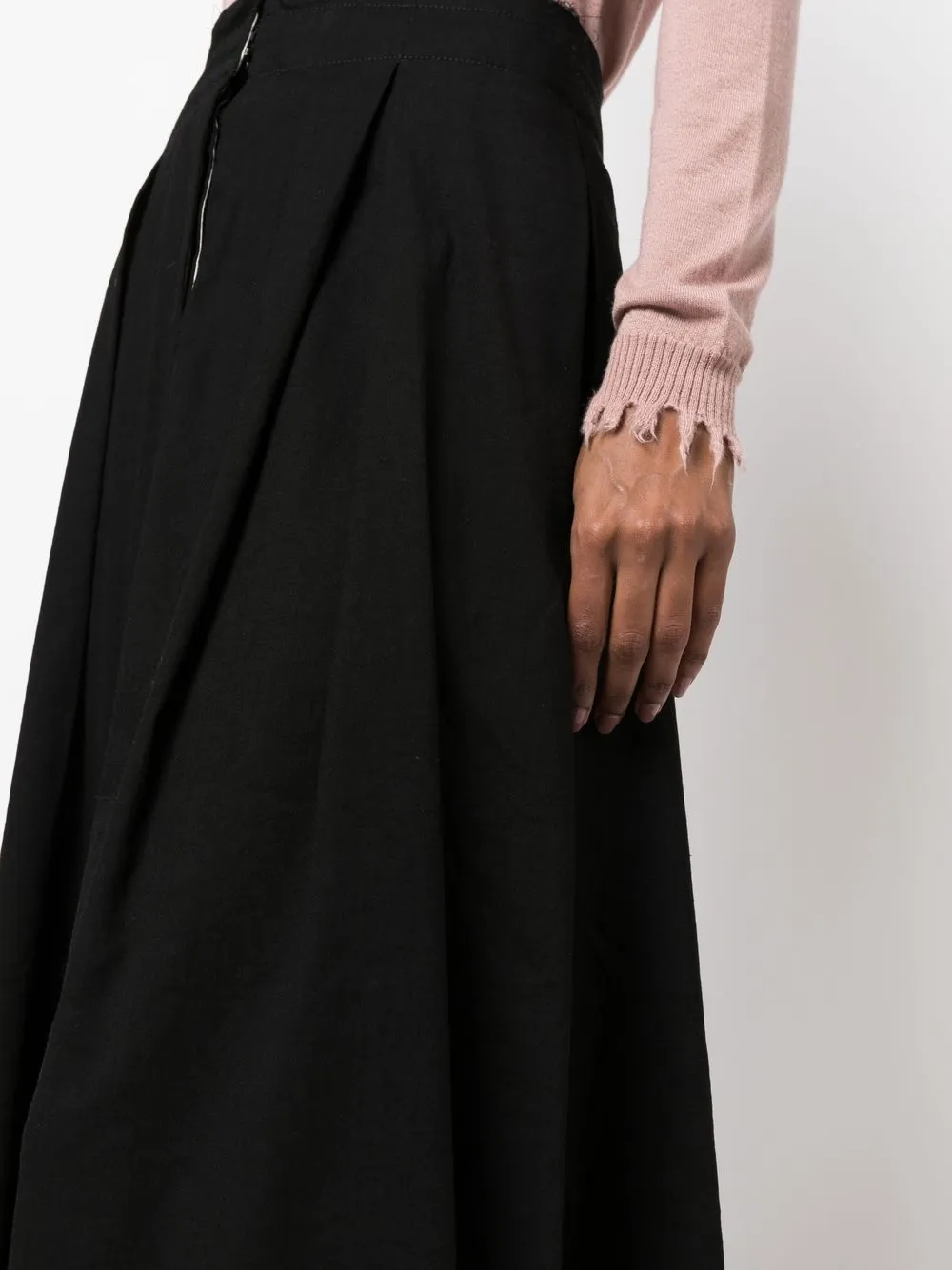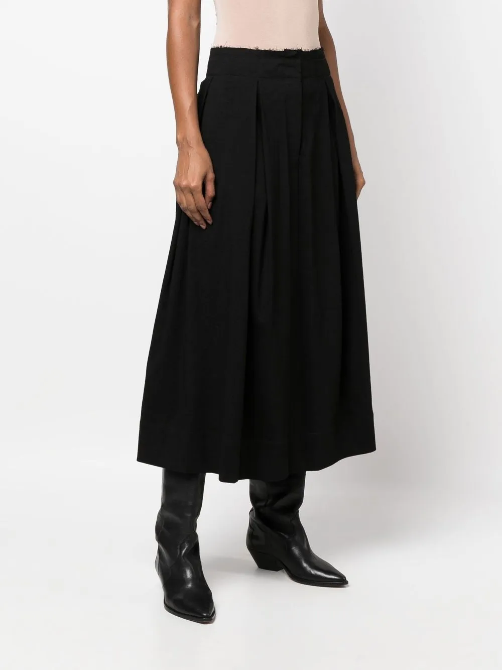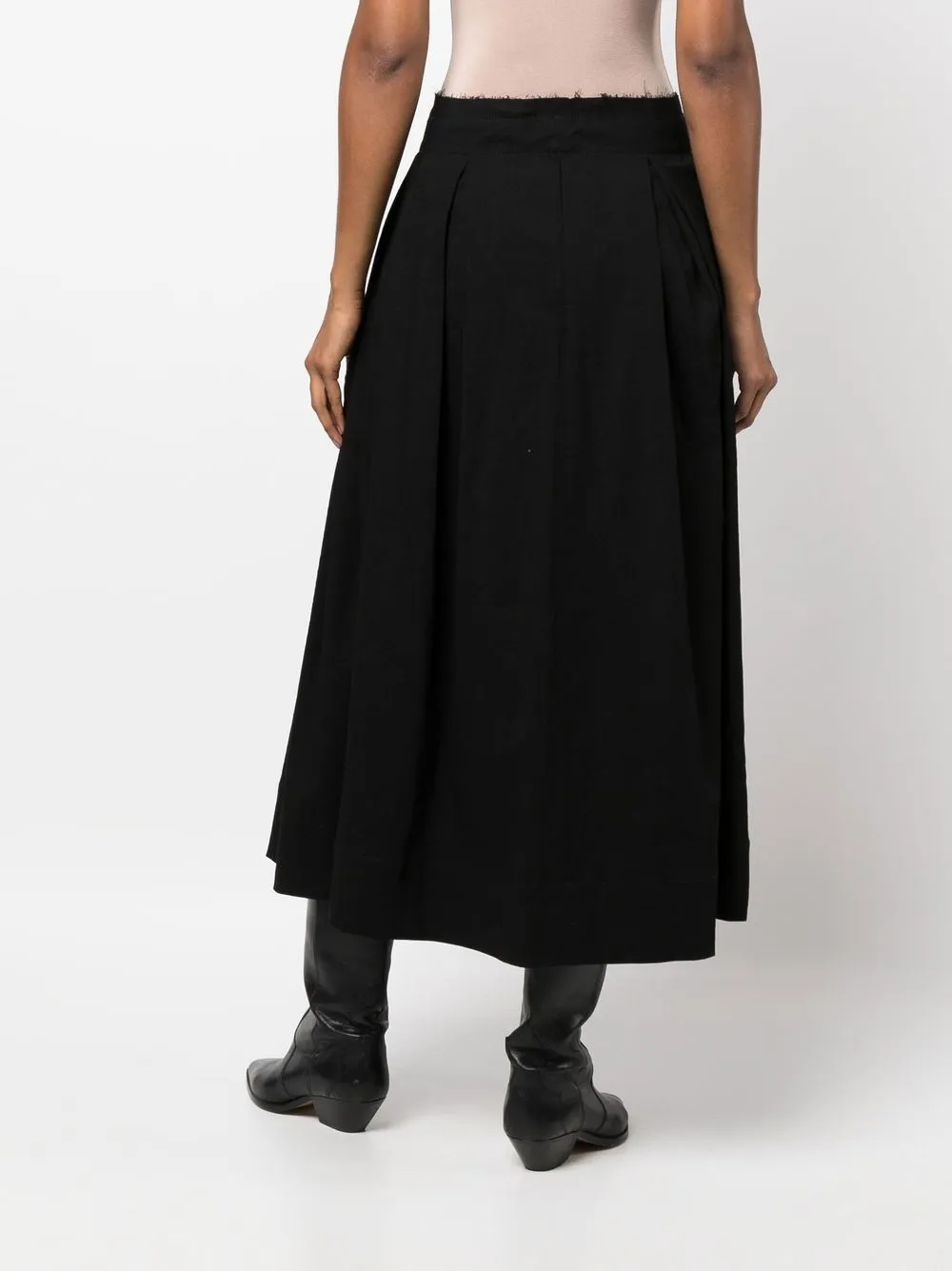 Черный, смесовый лен, завышенная талия, необработанные края, складки, потайная застежка спереди и длинная модель.
