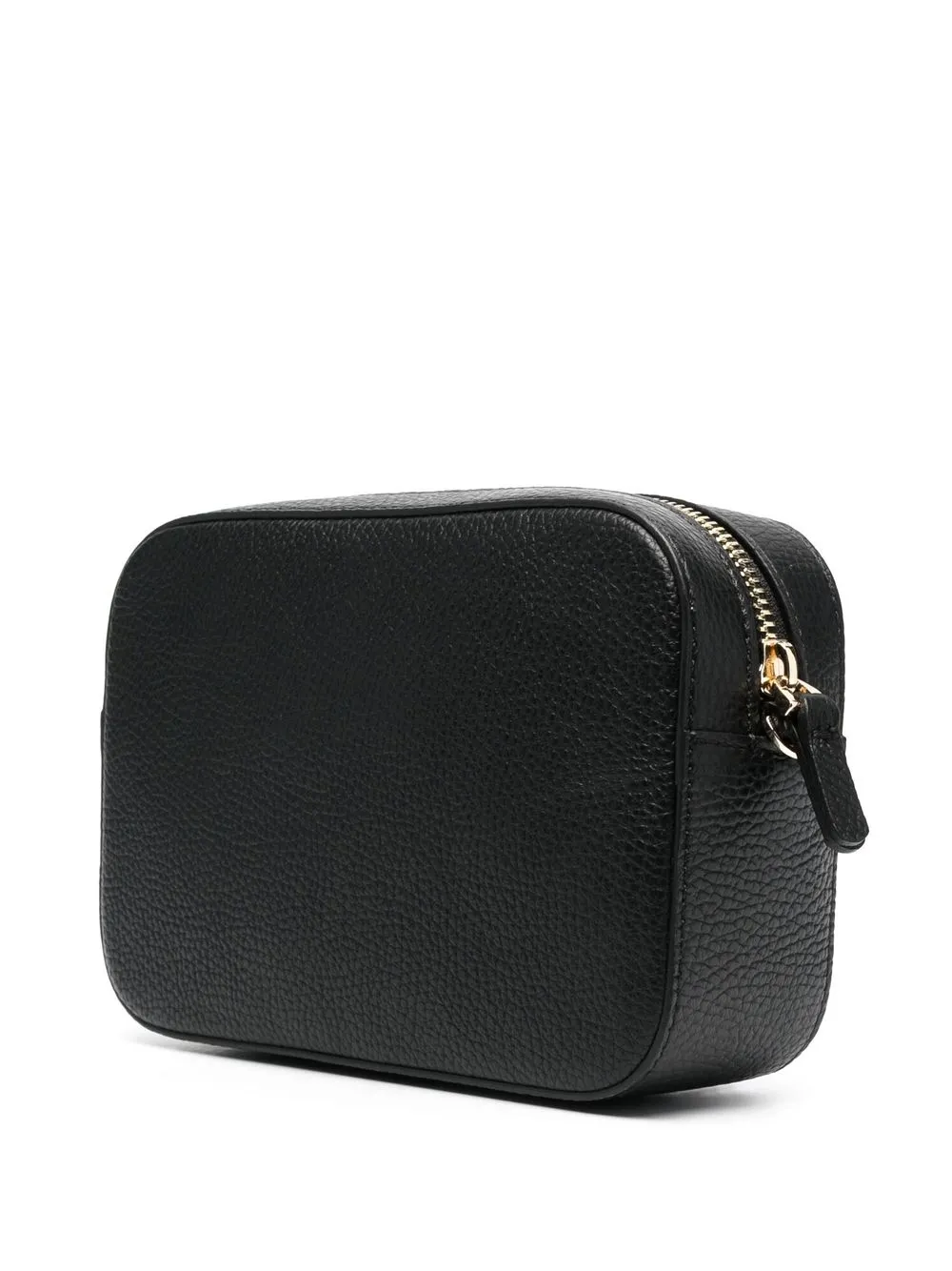 Черный, телячья кожа, золотистый металлический логотип, ремень на плечо с логотипом, застежка на молнии сверху и основное отделение.