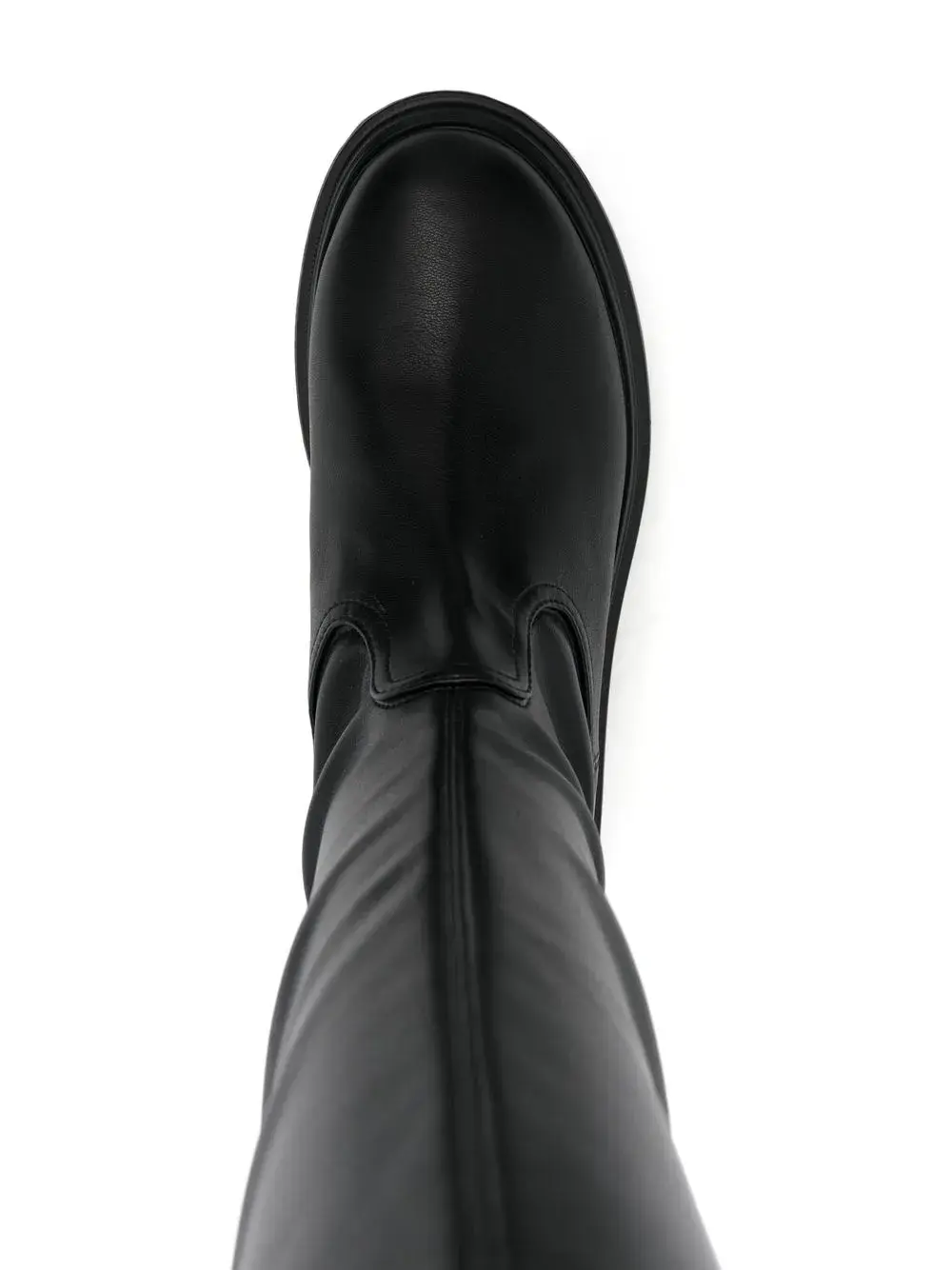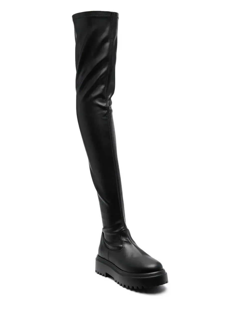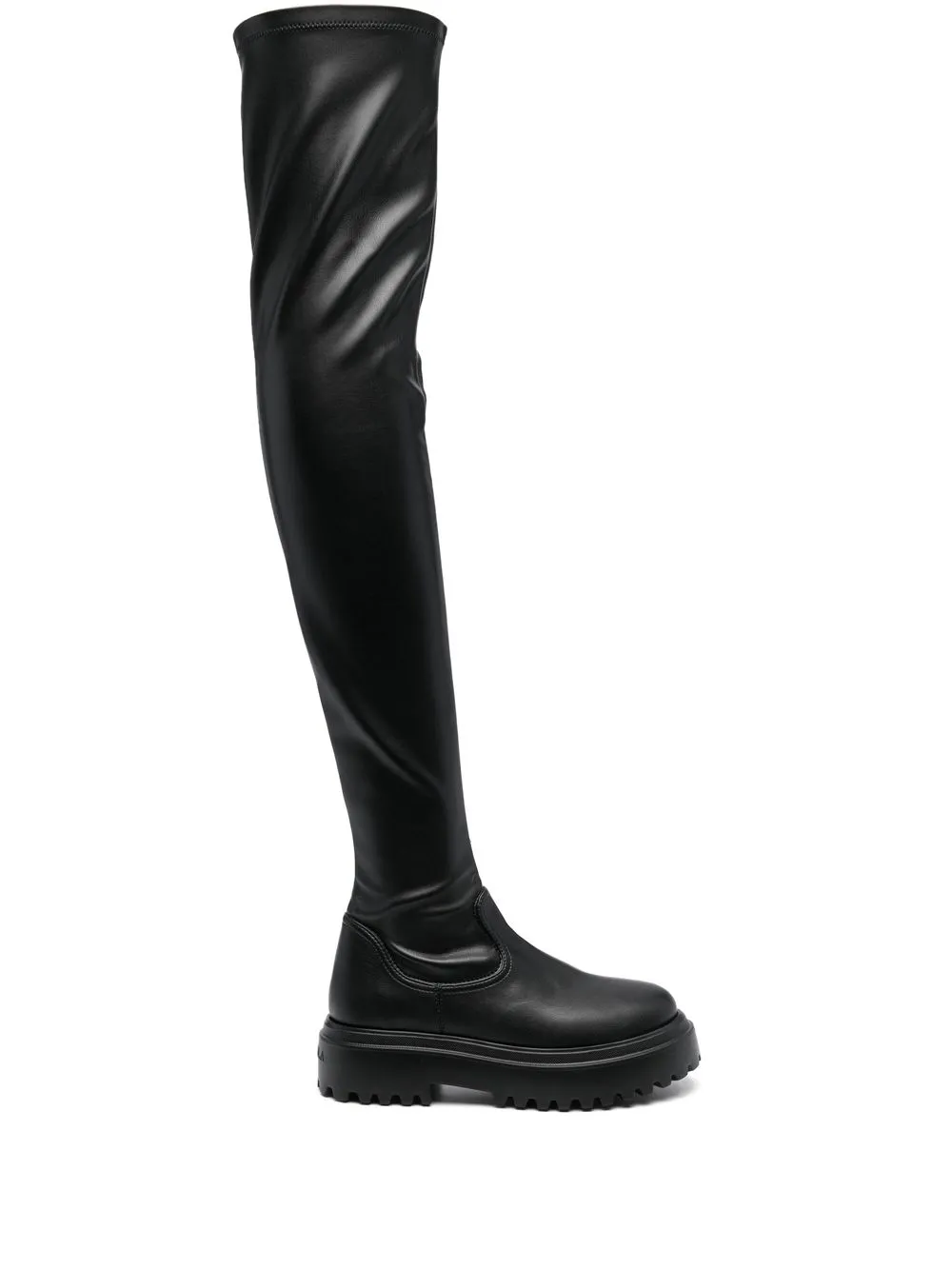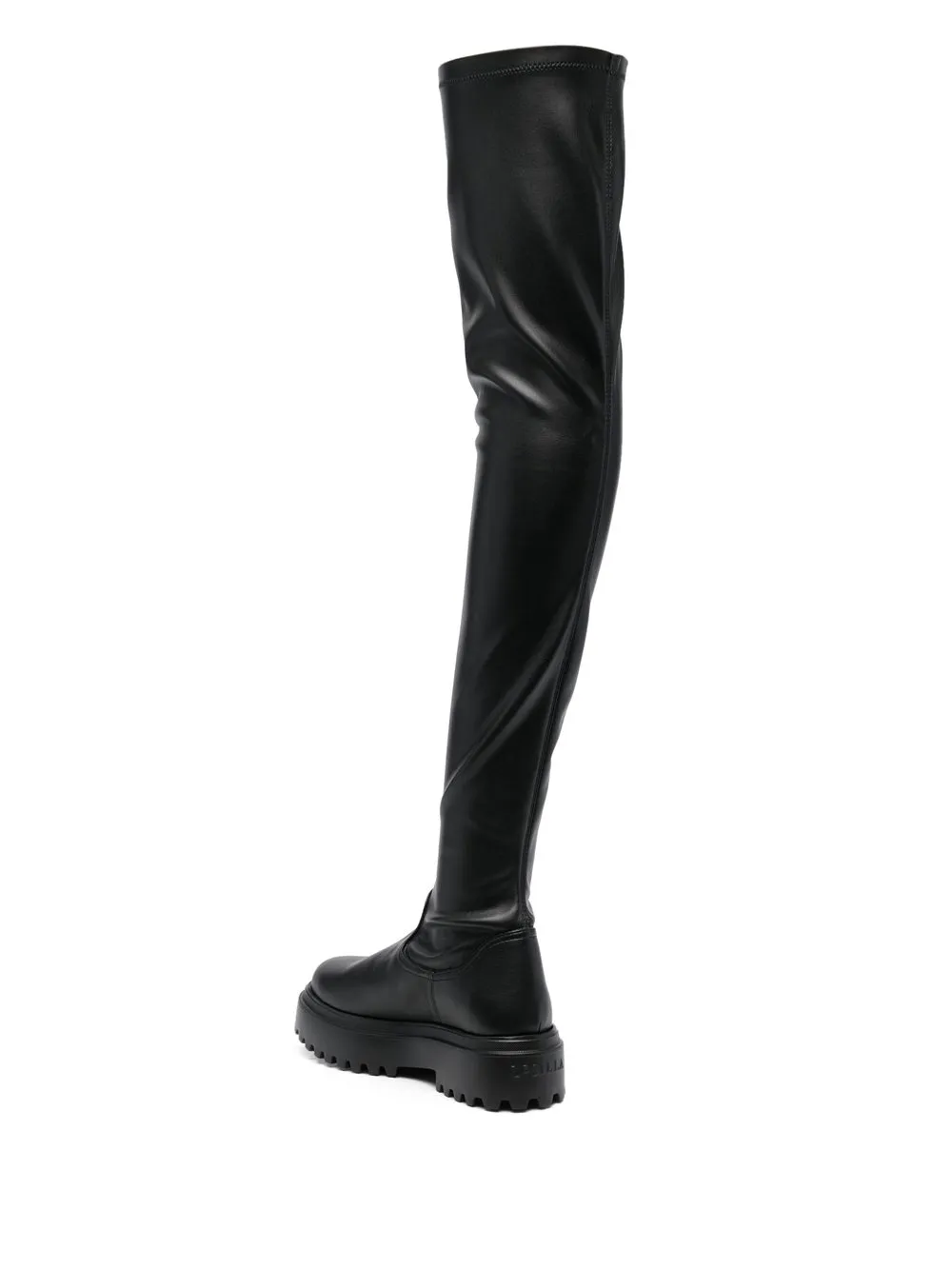 Черный, закругленный носок, стелька с логотипом, высота до линии бедра, низкий блочный каблук, рифленая резиновая подошва и модель без застежки.