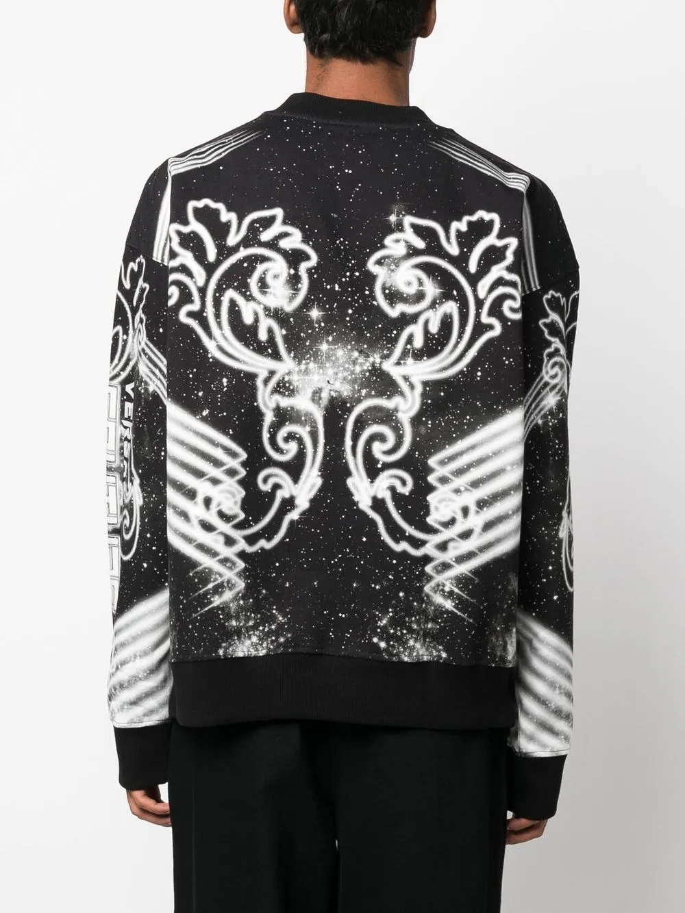 Черный/белый, хлопок, флисовый материал, отделка в рубчик, принт с изображением космоса, принт с логотипом на груди, круглый вырез, приспущенные плечи, длинные рукава и прямой подол.