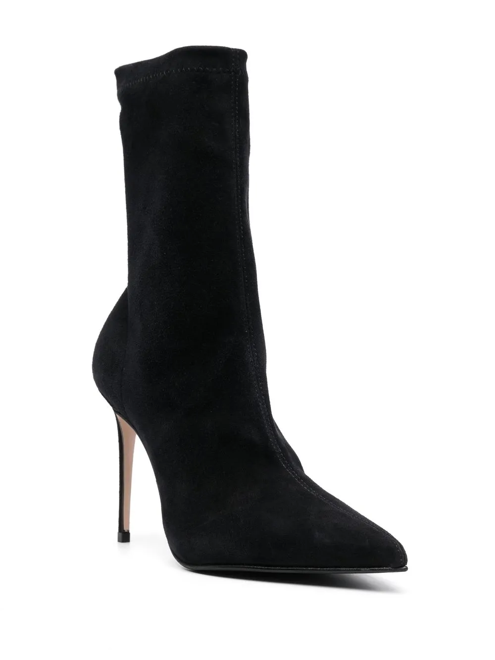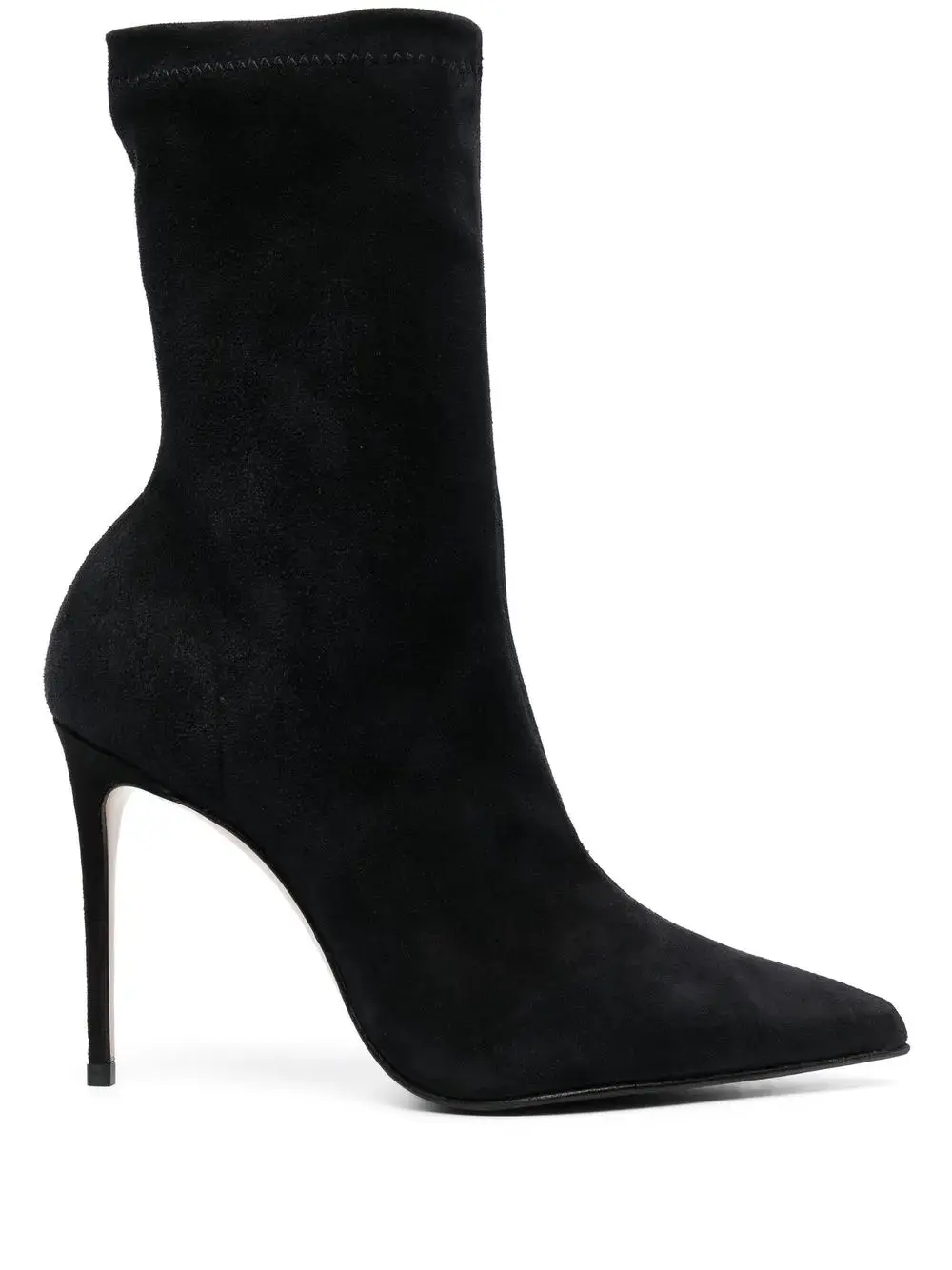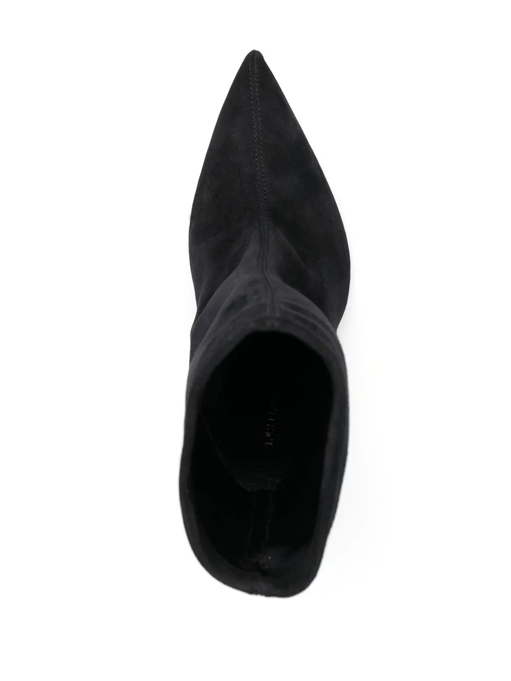 Черный, телячья кожа, отделка из замши, заостренный носок, стелька с логотипом, каблук на высокой шпильке, высота по щиколотку и модель без застежки.