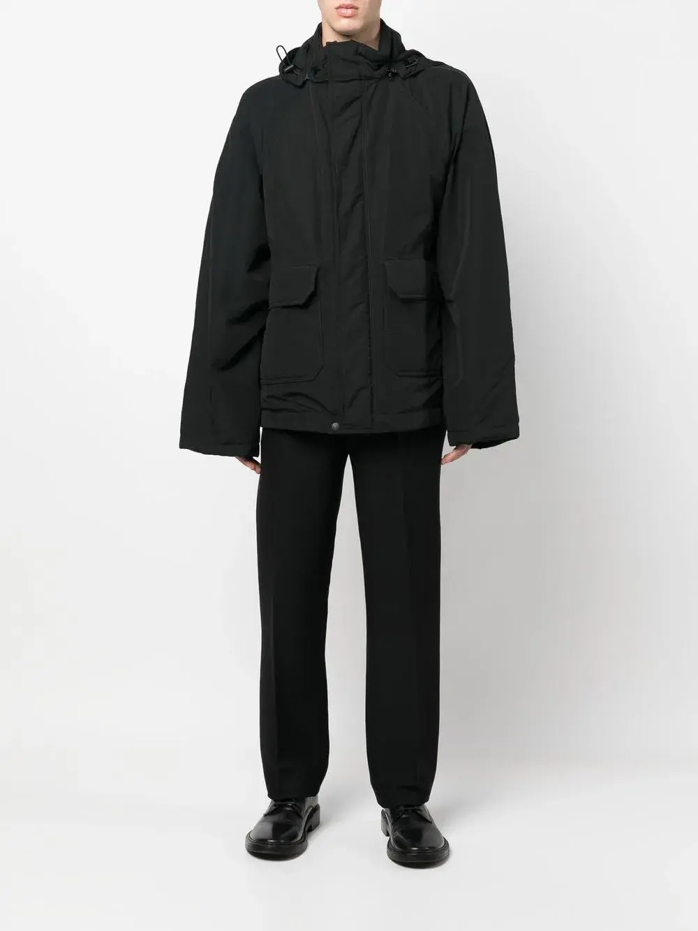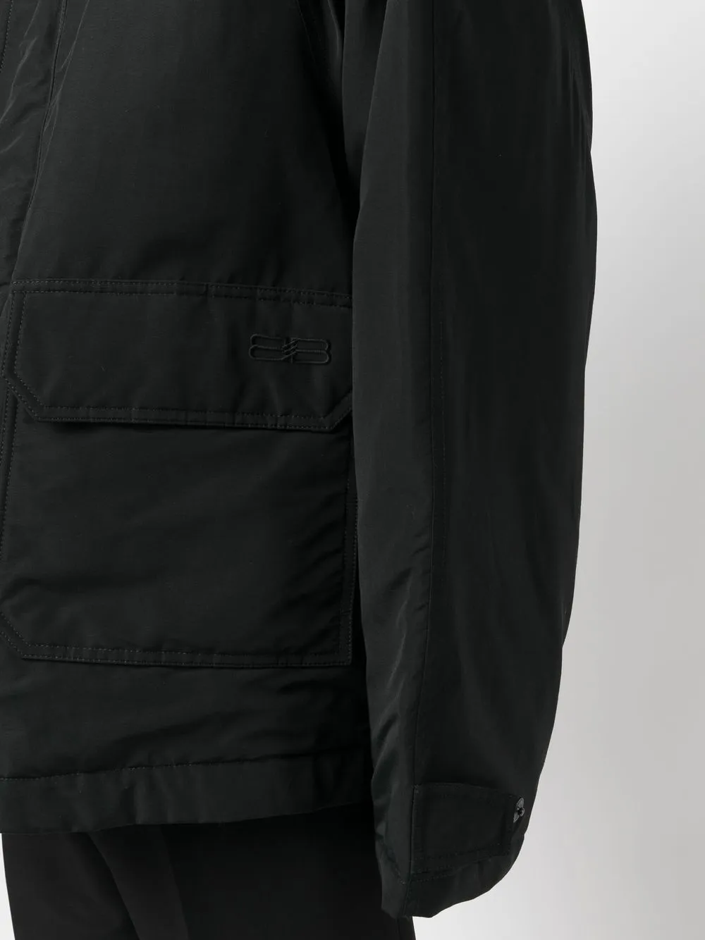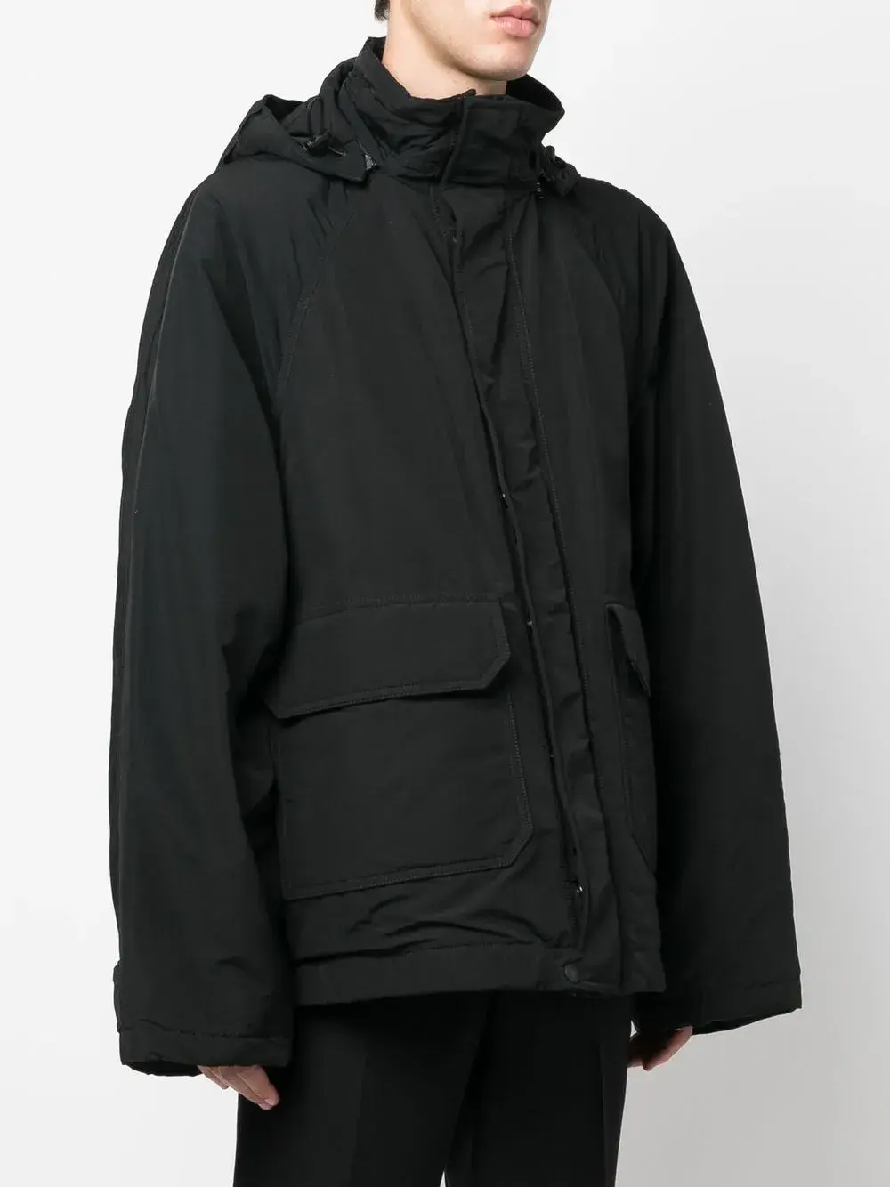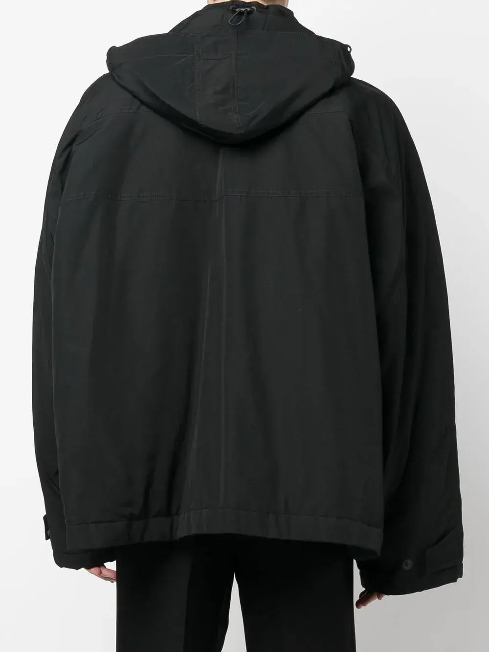 Черный, смесовый хлопок, съемный капюшон, воротник-стойка, длинные рукава реглан, застежка на кнопки и молнию спереди, два передних кармана с клапанами и стеганая подкладка.