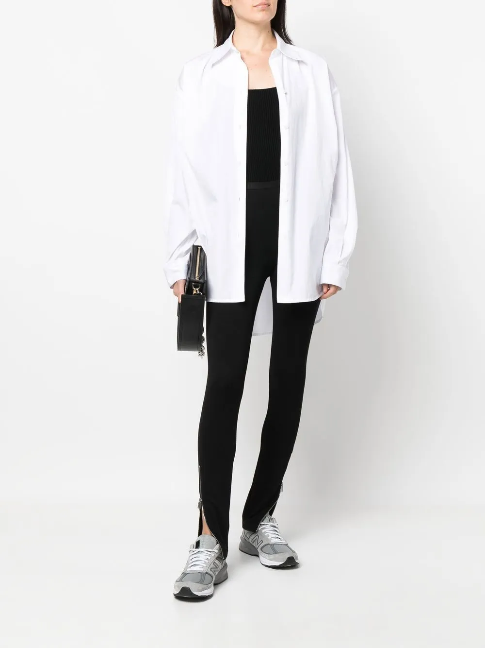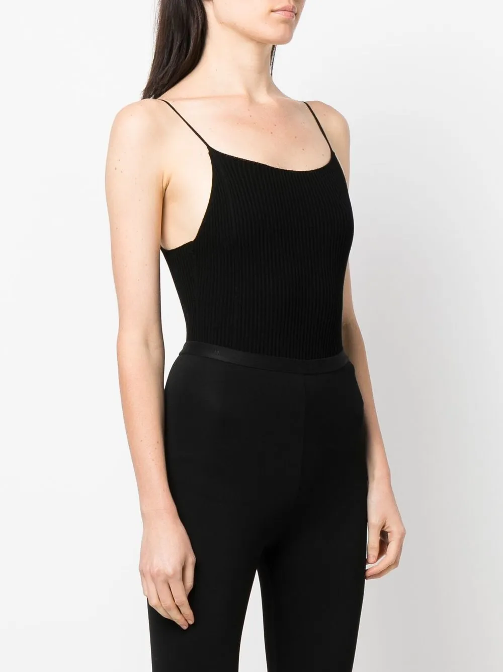 Черный, вискоза FSC, трикотаж в рубчик, U-образный вырез, тонкие бретели, без рукавов и квадратный вырез на спине. Эту вещь можно примерить, но только поверх собственного белья.