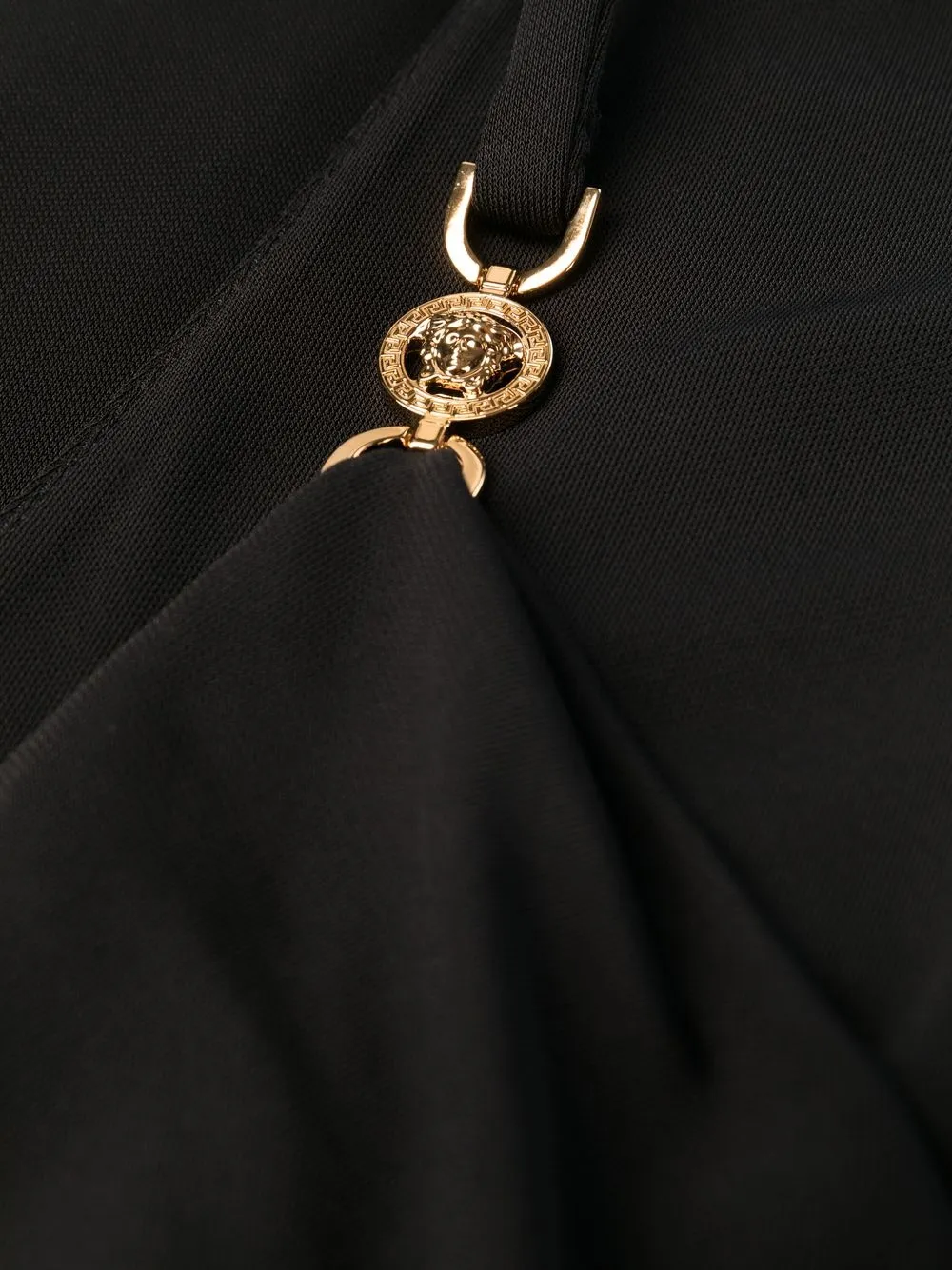 Черный, эластичный материал, декор Medusa, золотистая фурнитура, воротник-хомут, застежка на молнии сзади, без рукавов и длина миди. Ответственный выбор: В состав этого товара входят материалы, сертифицированные организациями Forest Stewardship Council (FSC) или Programme for the Endorsement of Forest Certification (PEFC).