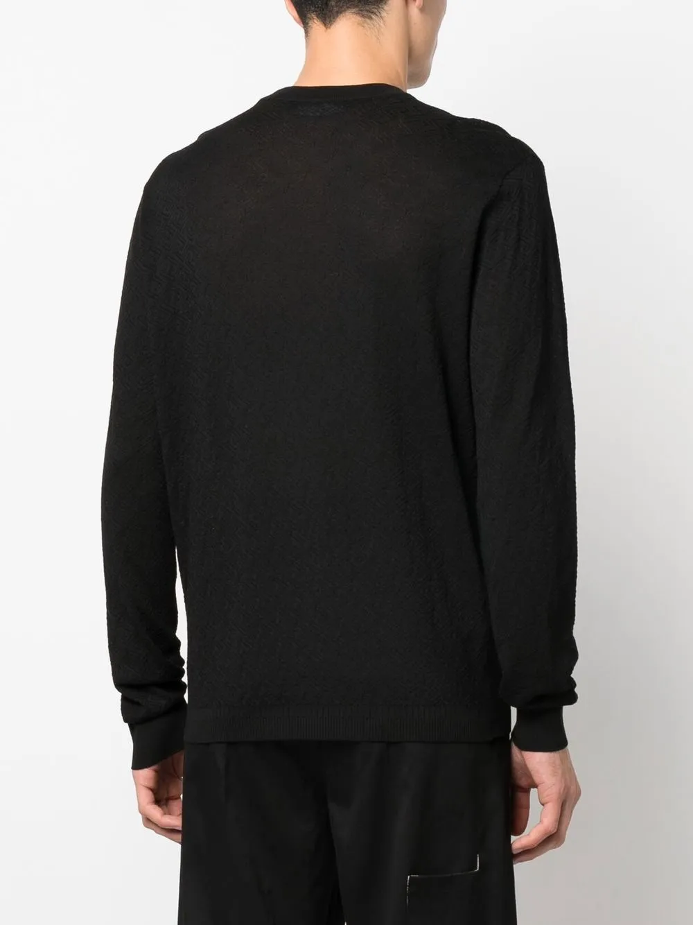 Черный, шелк, смесовый хлопок, тонкая вязка, знаковый орнамент Greca, края с вышитым логотипом, круглый вырез, модель анорак, длинные рукава и вязаные края в рубчик.