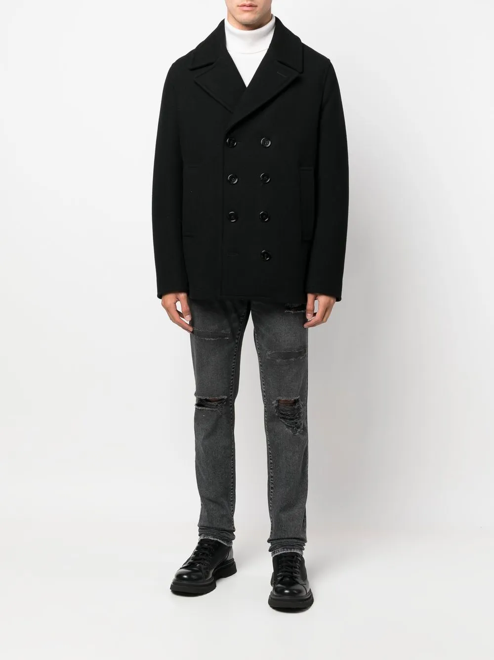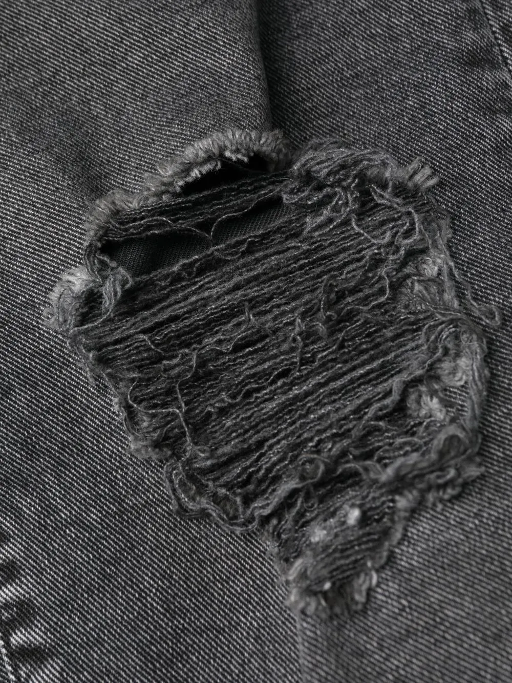Черный, эффект потертости, эффект потертости, потайная молния спереди, петли для ремня, пять карманов, средняя посадка и прямой крой.