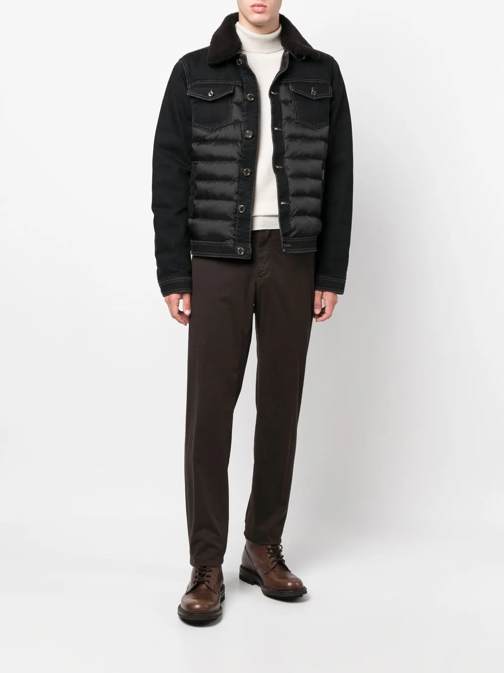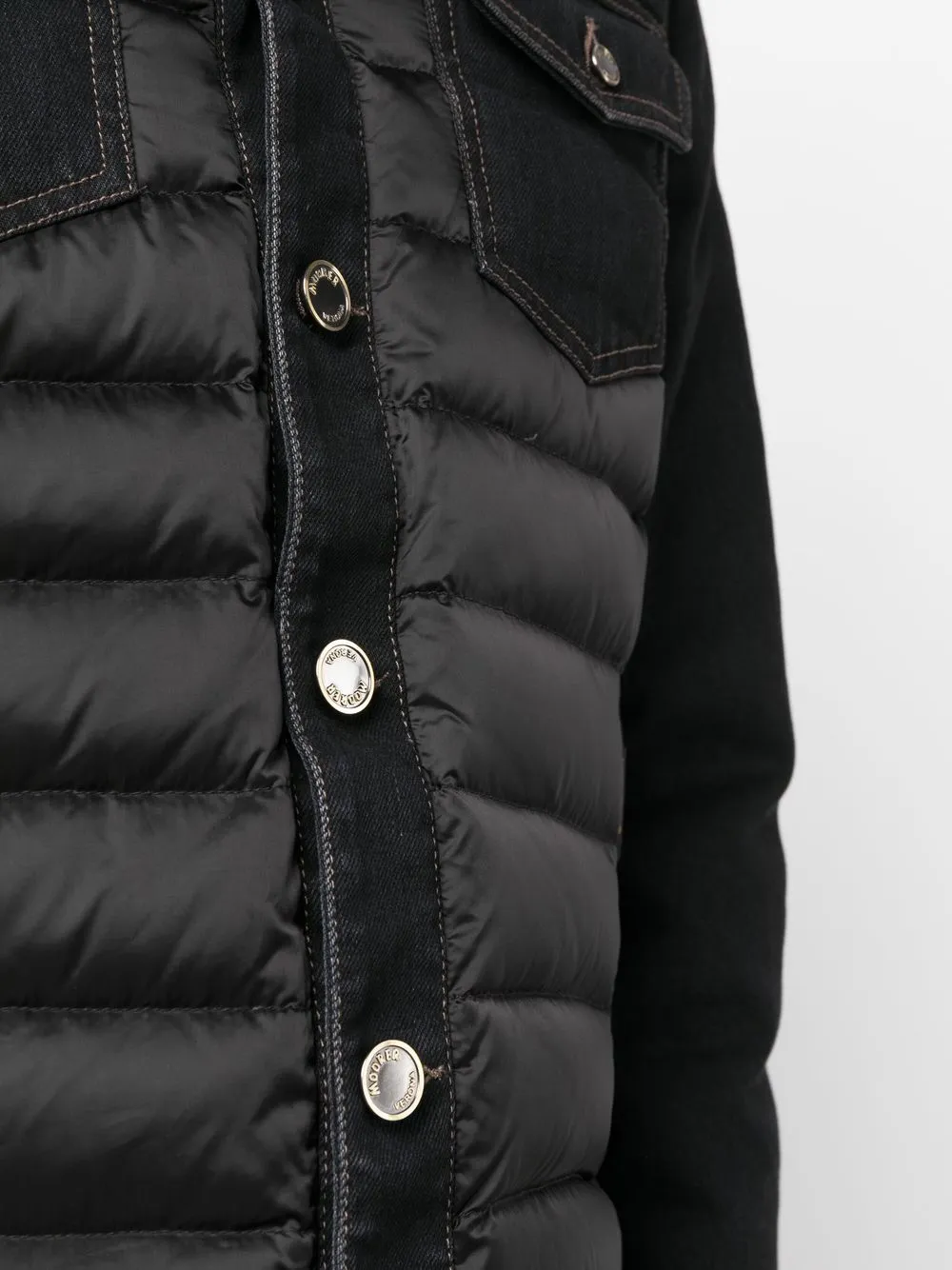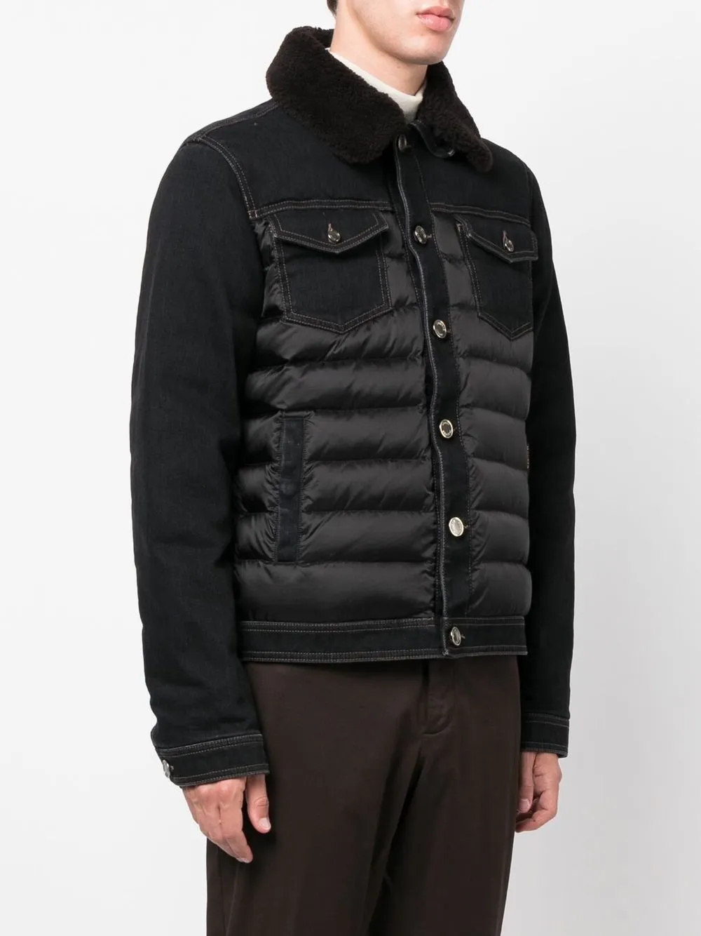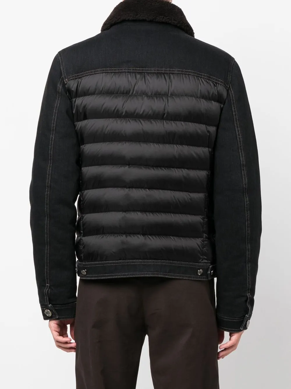 Черный, смесовый хлопок, дутый материал, наполнитель из смеси пуха и пера, отделка денимом, отделка из искусственной овчины, классический воротник, застежка на пуговицах спереди, длинные рукава, два нагрудных кармана с клапанами, два прорезных кармана по бокам и прямой подол.