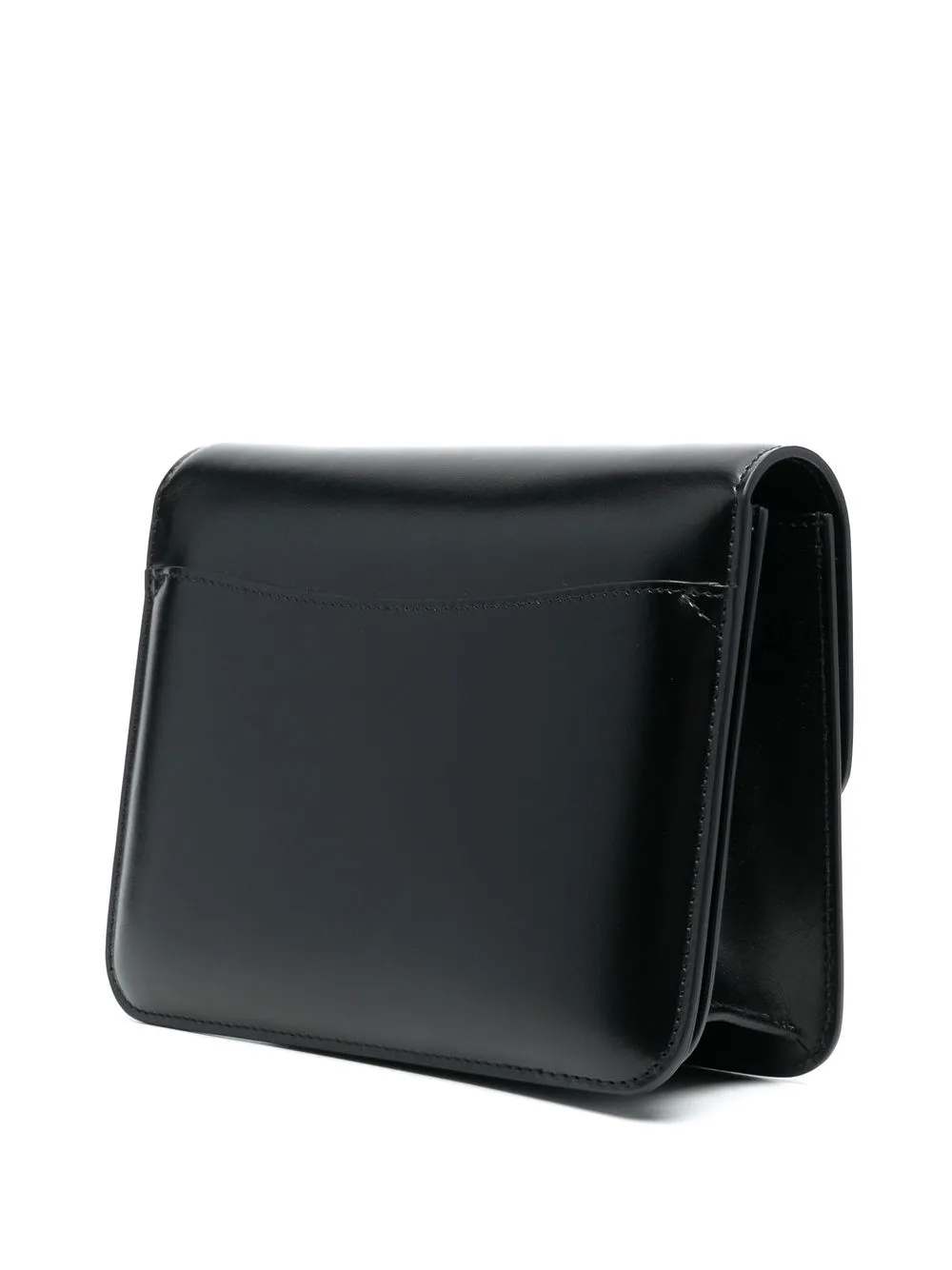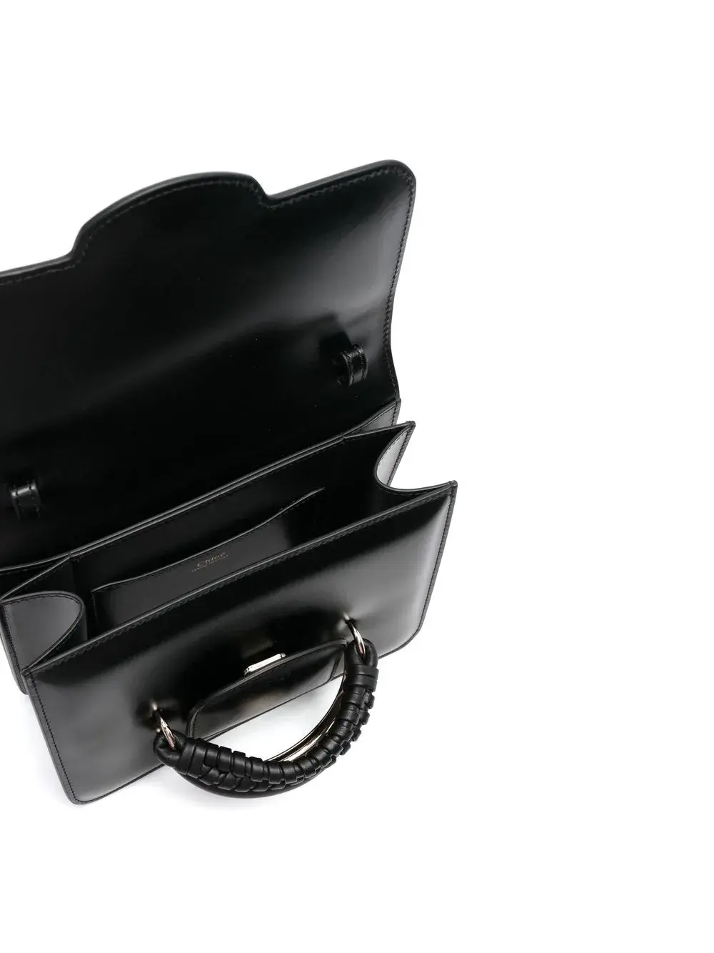 Черный, телячья кожа, тисненый логотип спереди, плетеная отделка, золотистая фурнитура, съемный регулируемый ремень на плечо, откидной клапан, основное отделение и внутренний прорезной карман.