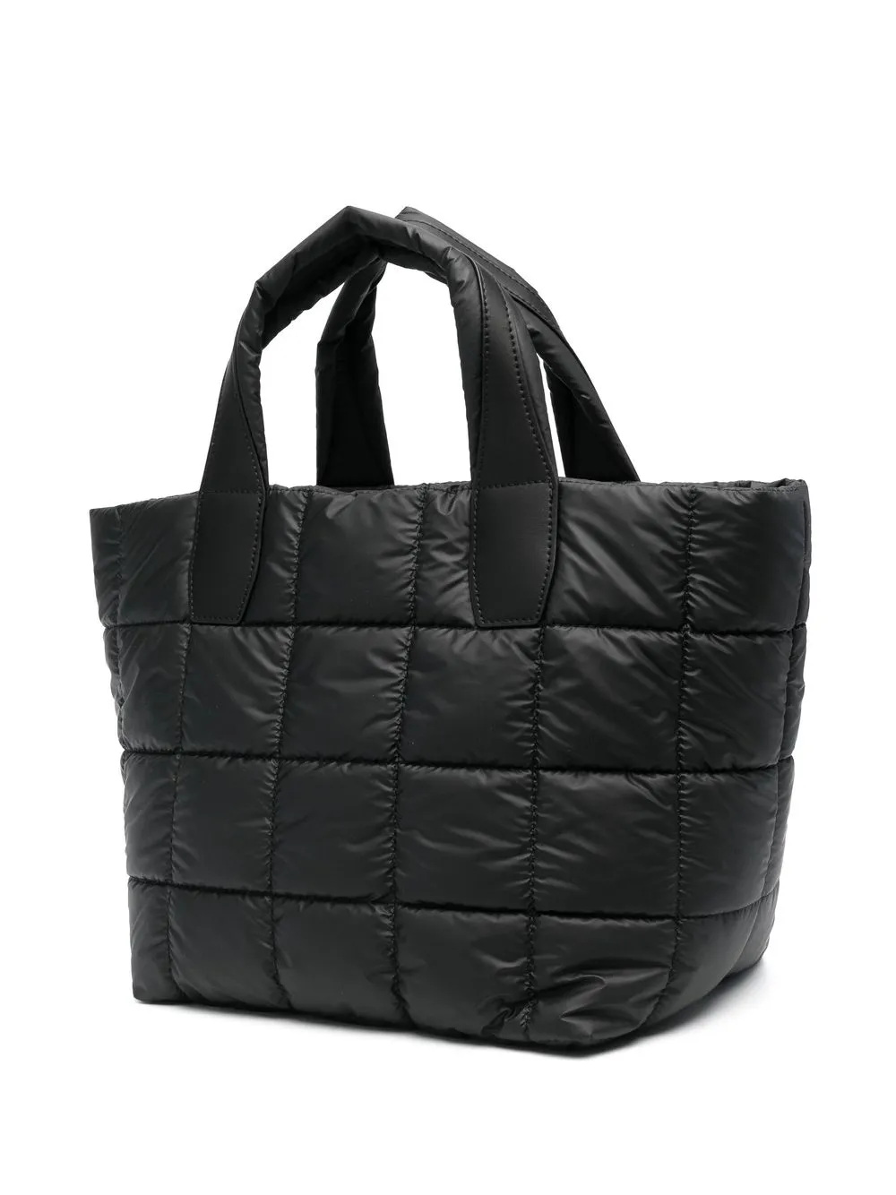 Черный, переработанный нейлон, матовое покрытие, стеганая модель, две верхние ручки, съемный ремень на плечо, основное отделение и съемная косметичка.