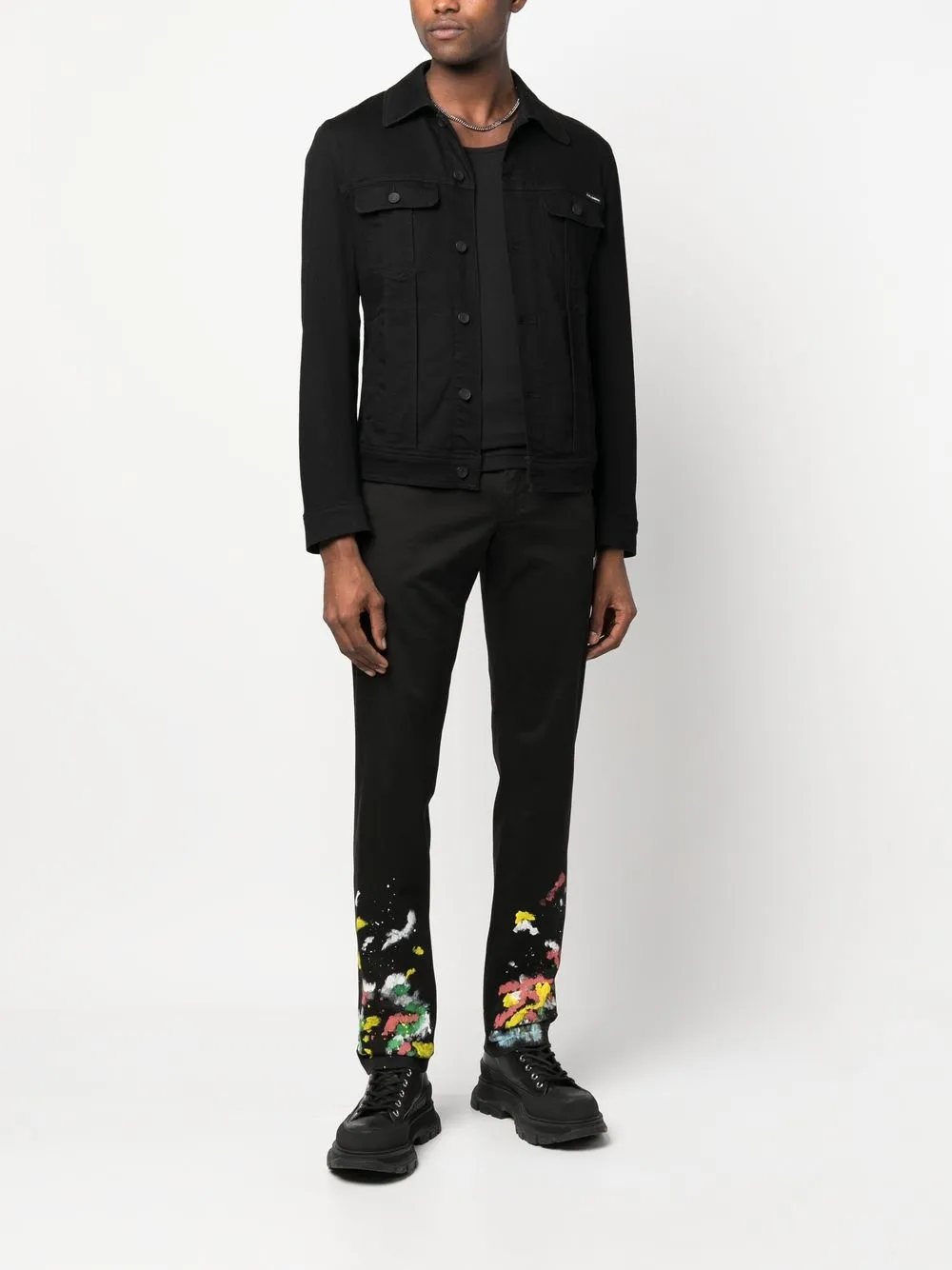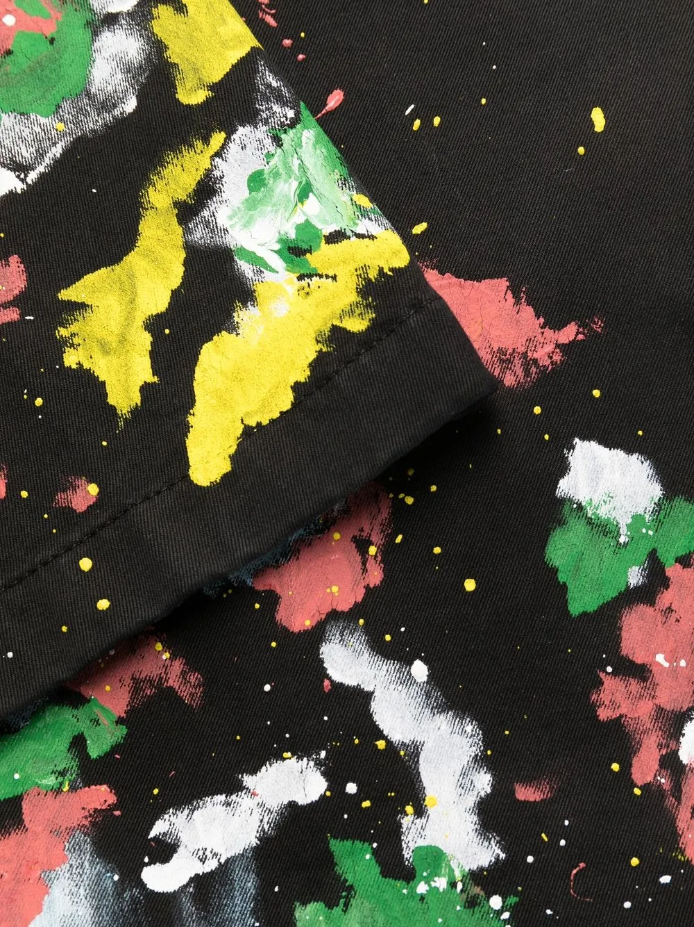 Черный/разноцветный, смесовый хлопок, эффект разбрызганной краски, петли для ремня, застежка на молнии и пуговице спереди, пять карманов и прямой крой.