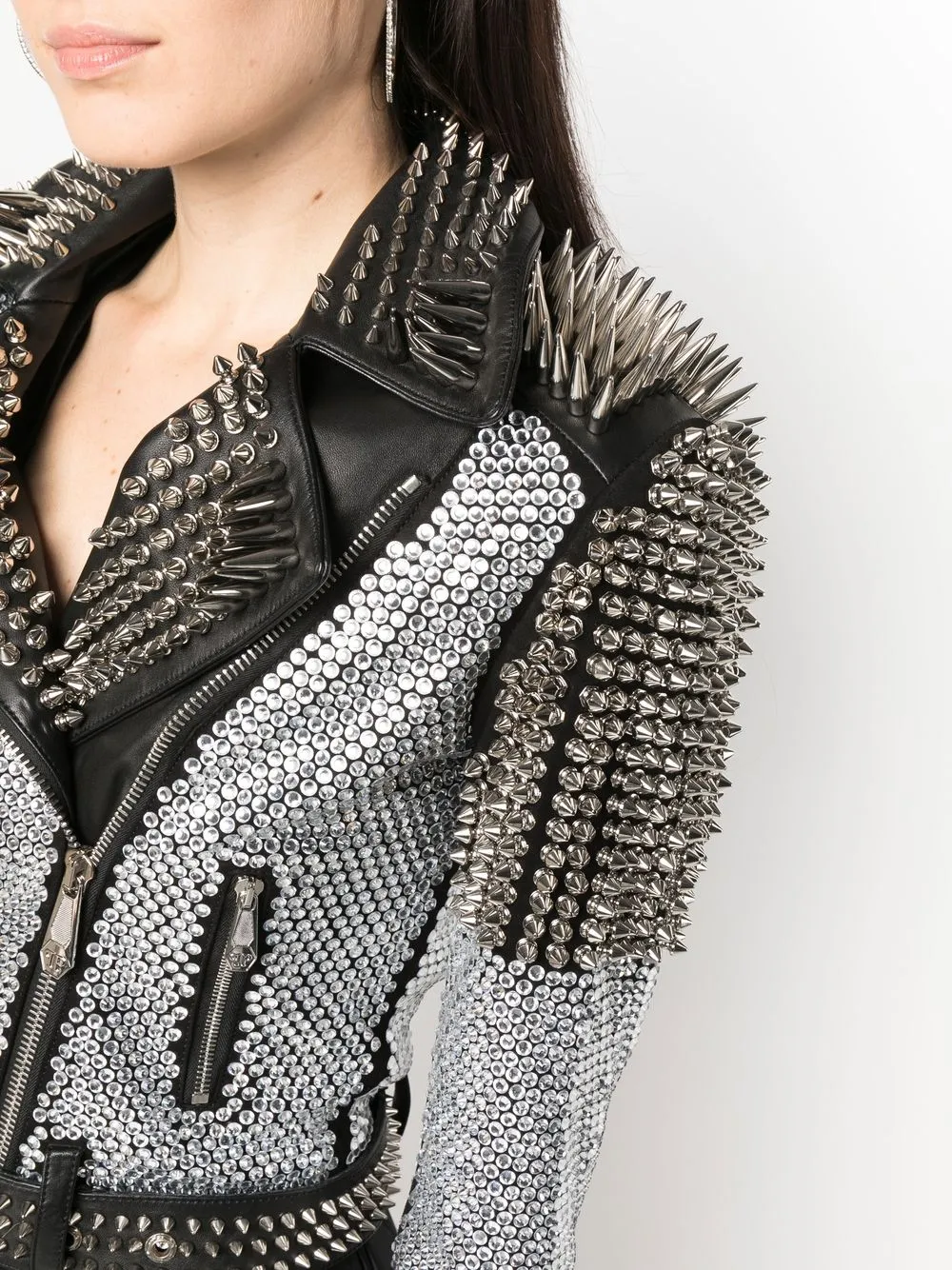 Серебристый, черный, овечья кожа, оправа в байкерском стиле, декор из кристаллов, серебристые заклепки, застежка на молнии спереди, длинные рукава и передние карманы на молнии.
