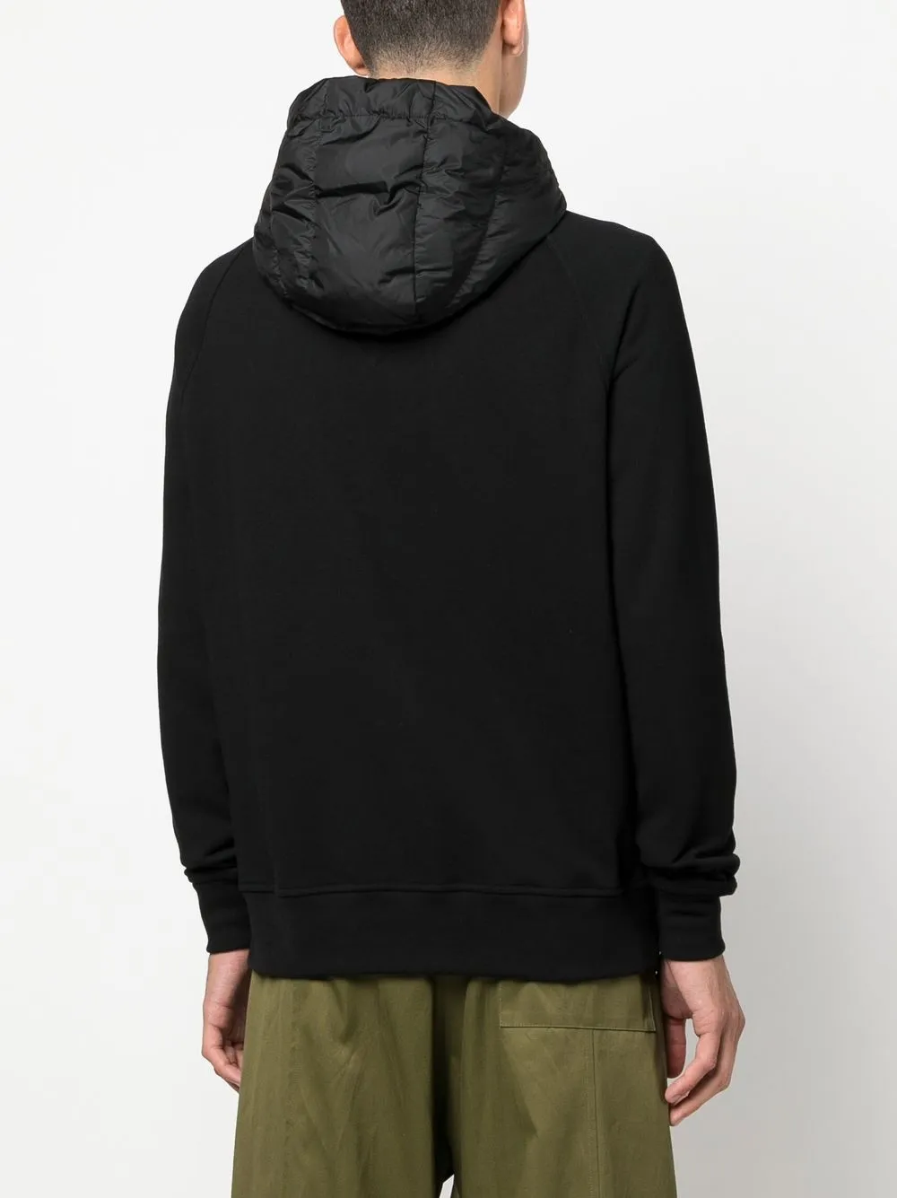 Черный хлопок затягивающийся на шнурок капюшон длинные рукава двусторонняя молния спереди два прорезных кармана по бокам прямой подол нашивка с логотипом на рукаве