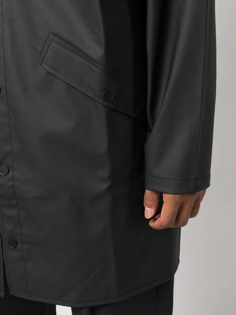 Водонепроницаемый материал, два кармана с клапанами по бокам, застежка на кнопках спереди, затягивающийся на шнурок капюшон, длинные рукава, длина миди и прямой подол. Conscious: Мы объединились с агентством Good On You, которое оценивает бренды по степени их влияния на животных, людей и планету в целом.