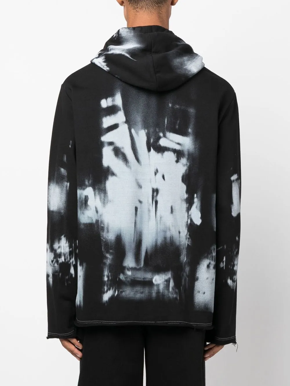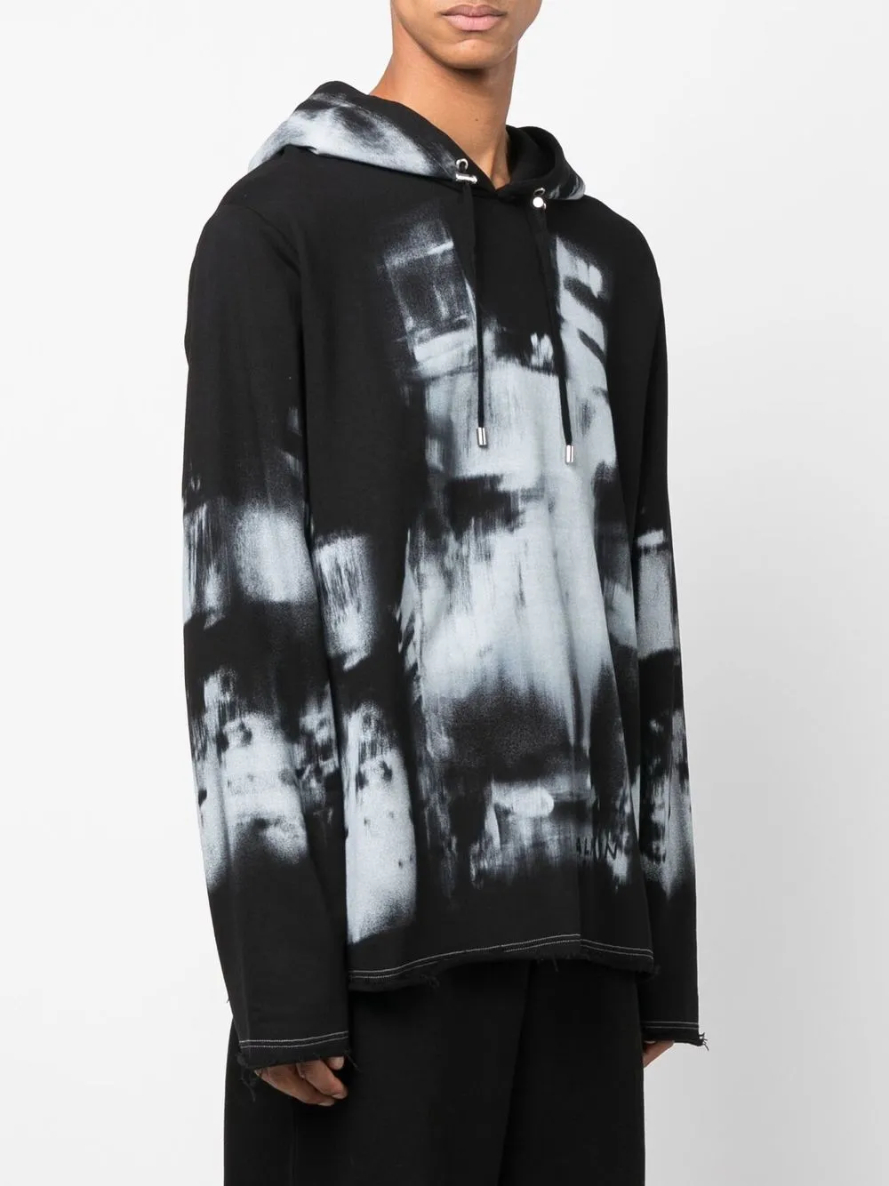 Черный, хлопок, сплошной графичный принт, затягивающийся на шнурок капюшон, длинные рукава и прямой подол.