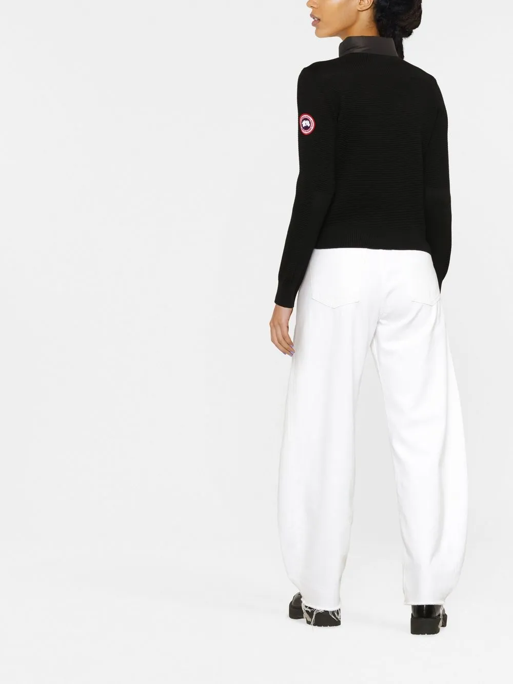 Высокий воротник, застежка на молнии спереди, длинные рукава и два кармана на молнии по бокам.