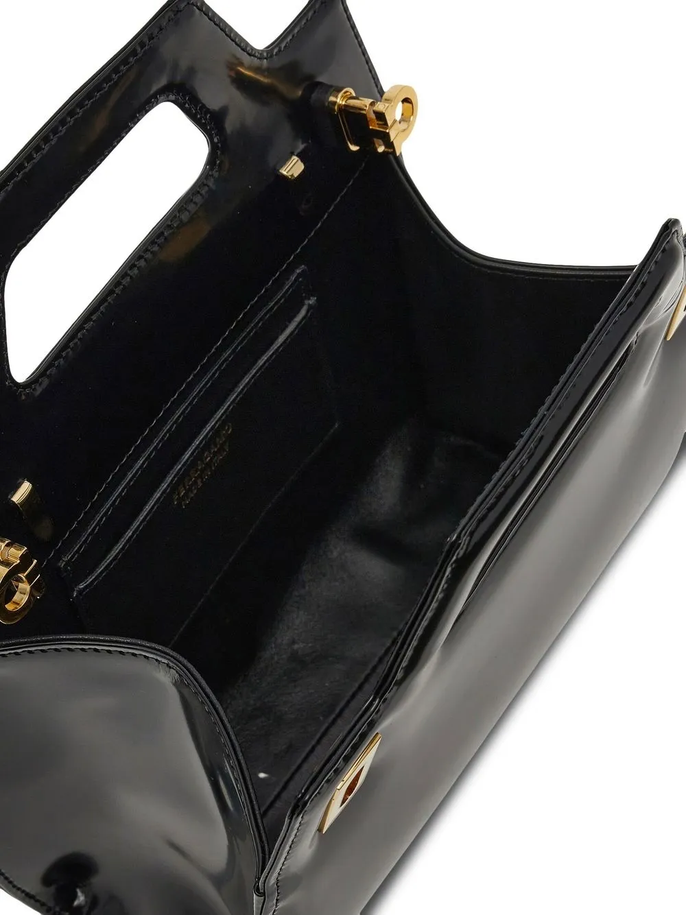Черный, телячья кожа, глянцевая фактура, золотистая фурнитура, тисненый логотип внутри, две плоские верхние ручки, застежка Gancini с поворачивающимся замком , основное отделение и внутренние отделения для карт.