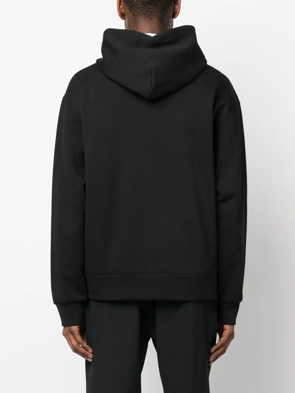 Черный, смесовый хлопок, вышитый логотип, классический капюшон, длинные рукава и подол в рубчик.