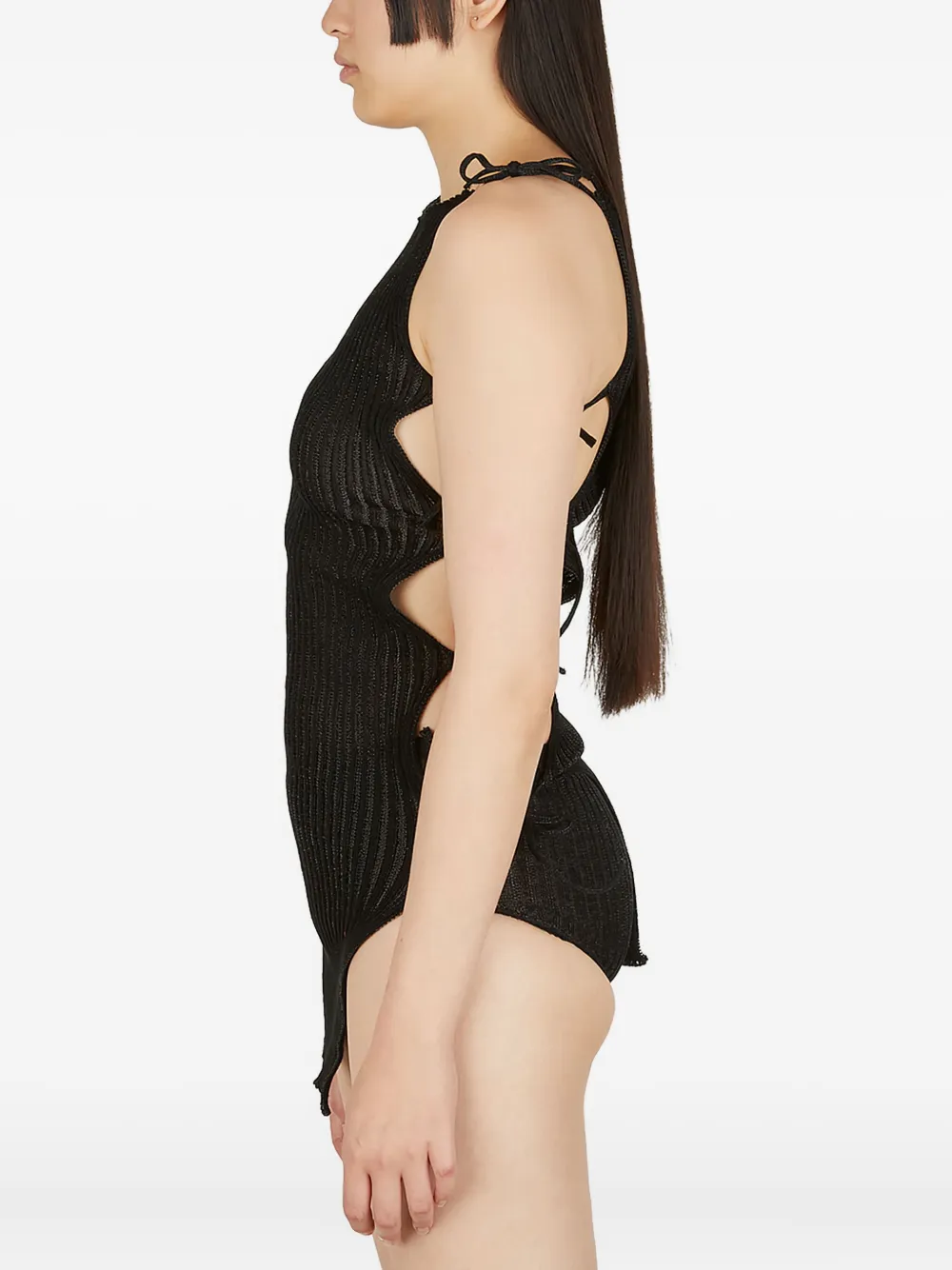 Черная ребристая вязка, асимметричный подгиб сбоку, шнуровка