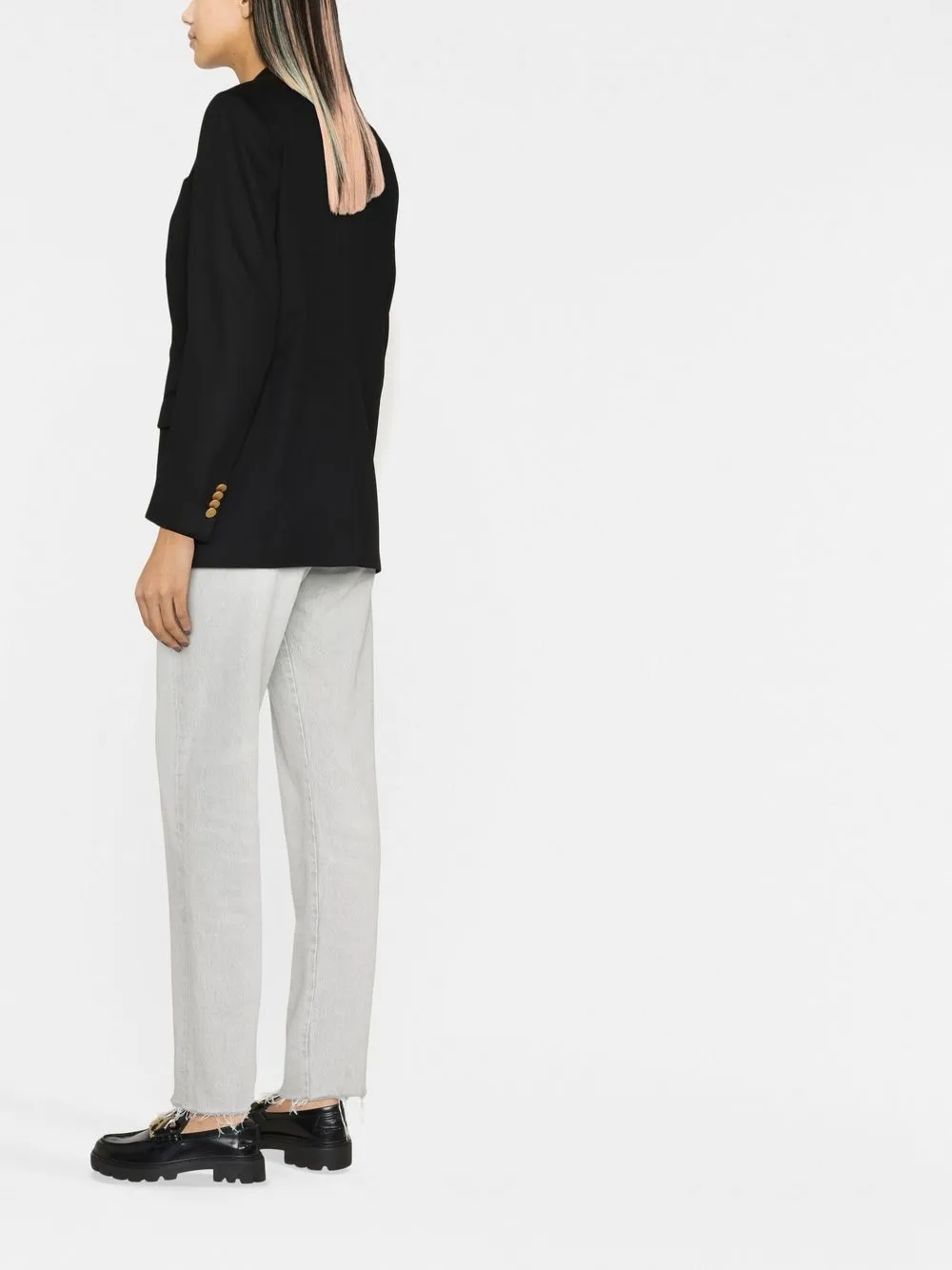 Черный, смесь шерсти и кашемира, широкие заостренные лацканы, двубортная застежка на кнопки, золотистые пуговицы, длинные рукава, манжеты на пуговицах, два кармана с клапанами по бокам, прорезной карман на груди и цельная подкладка.