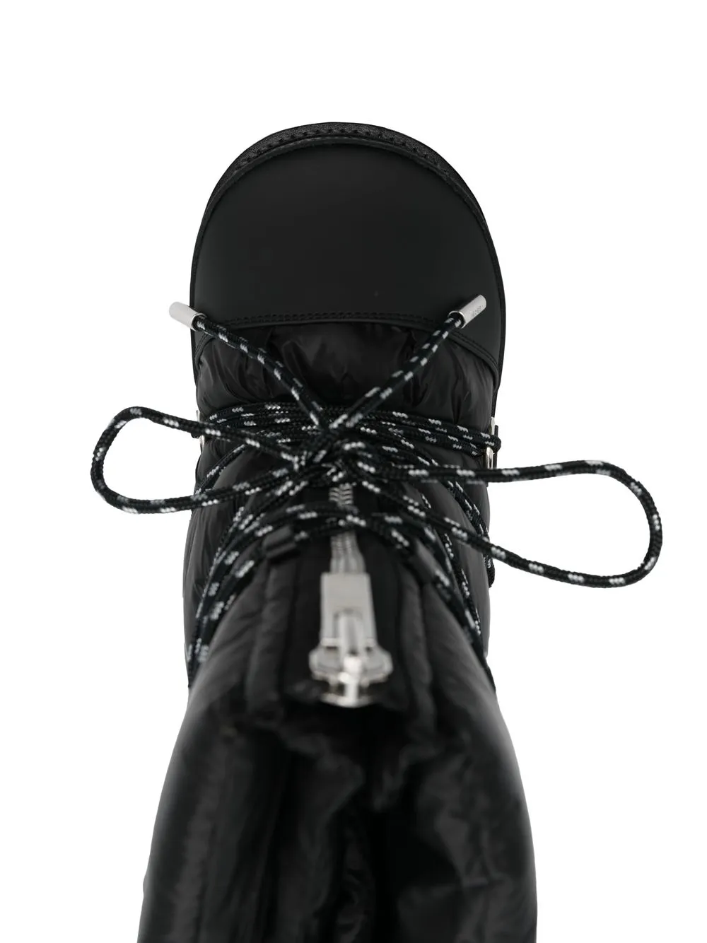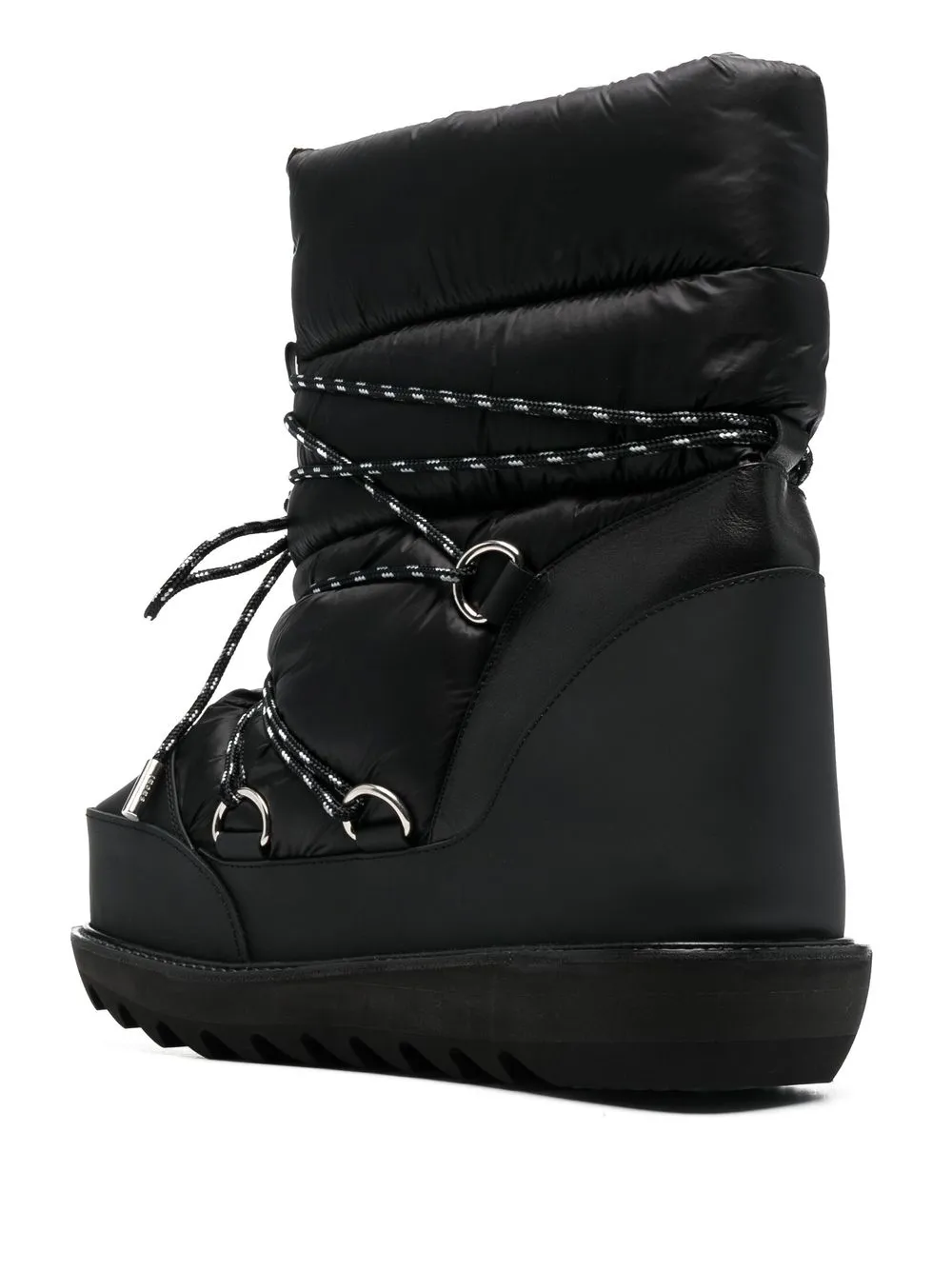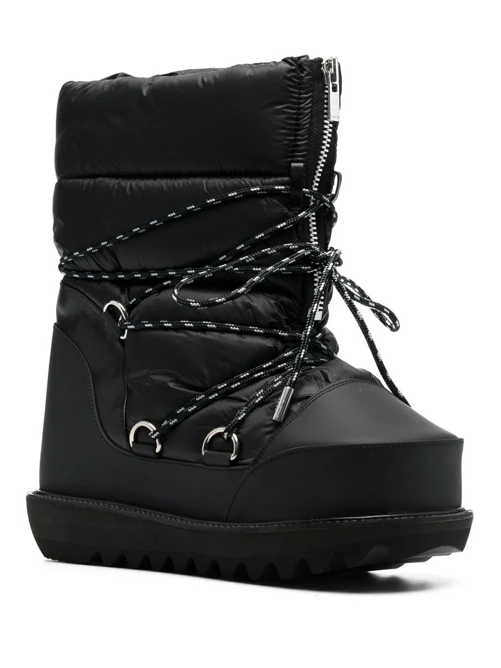 Черный, стеганая отделка, застежка на молнии спереди, шнуровка, серебристая фурнитура, закругленный носок, кожаная отделка и массивная резиновая подошва.