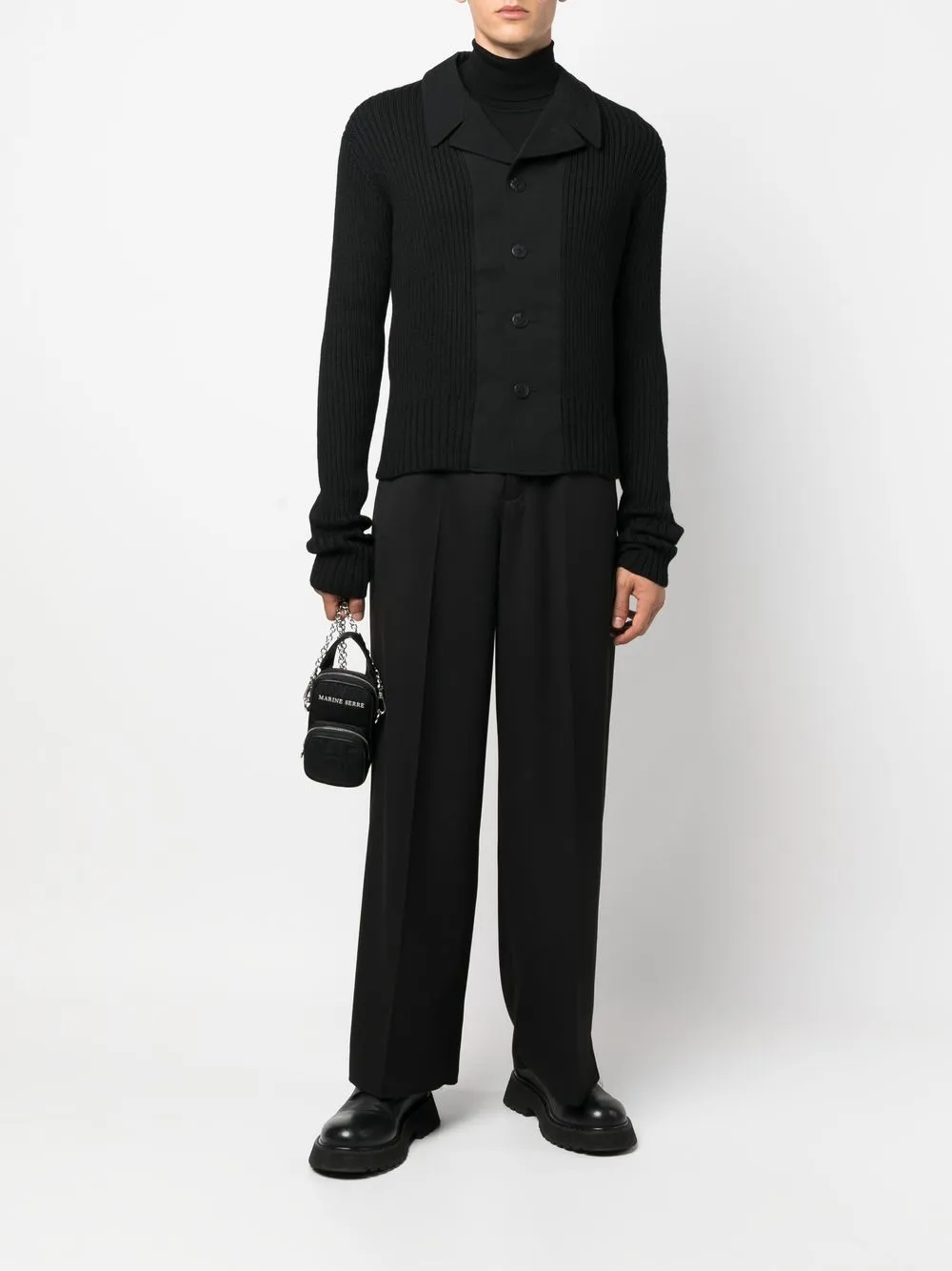 Черный, шерсть, тонкая вязка, детали в рубчик, зазубренные лацканы, застежка на пуговицах спереди, удлиненные рукава и прямой подол.