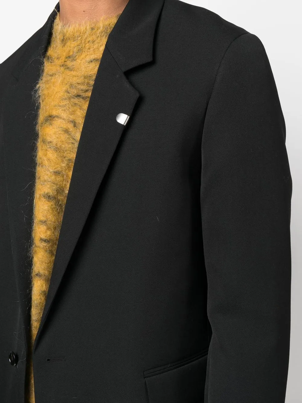 Черный, шерсть, хлопок, серебристая фурнитура, зазубренные лацканы, застежка на пуговицах спереди, два кармана с клапанами по бокам, длинные рукава, манжеты с разрезами и цельная подкладка.