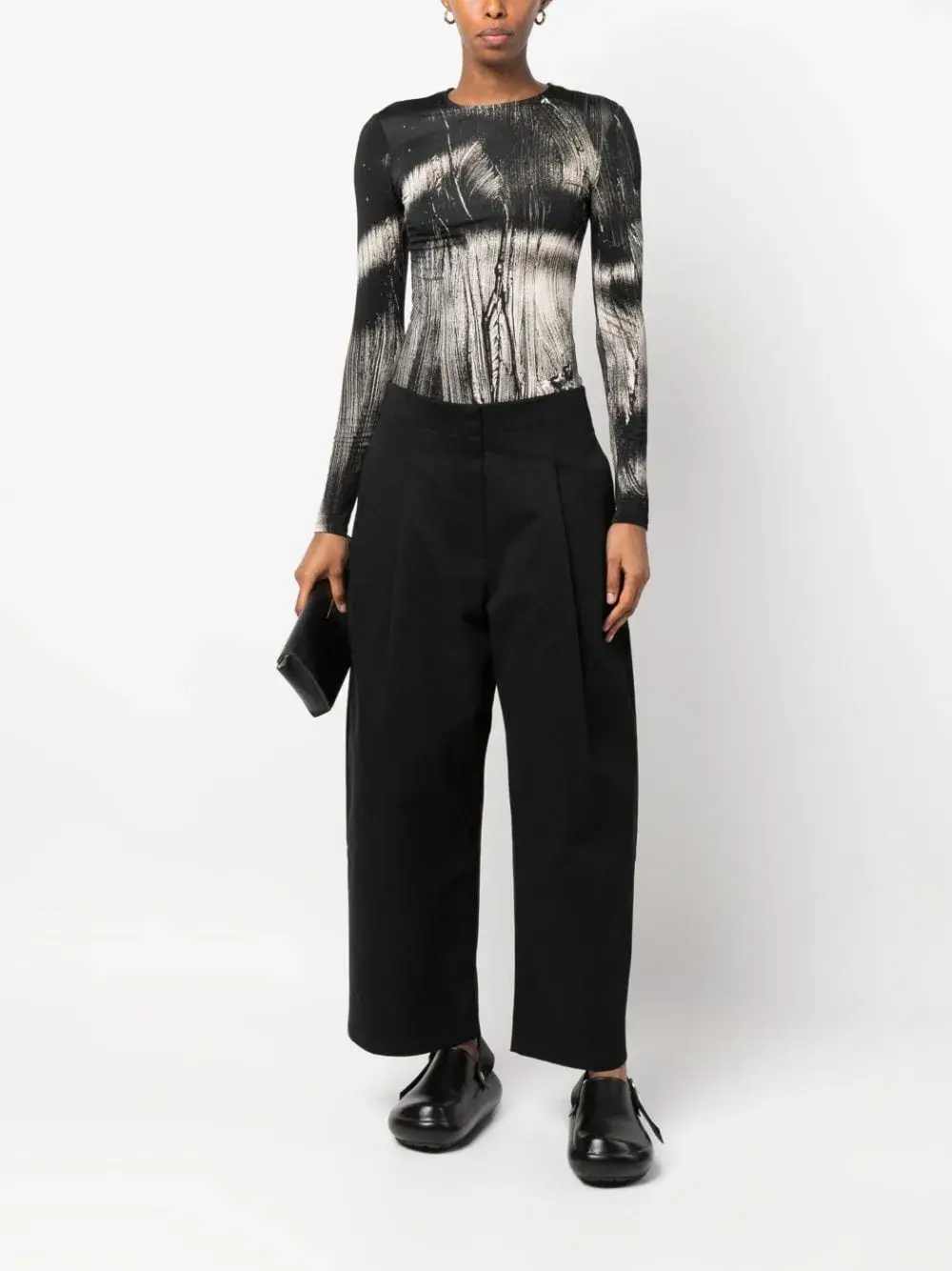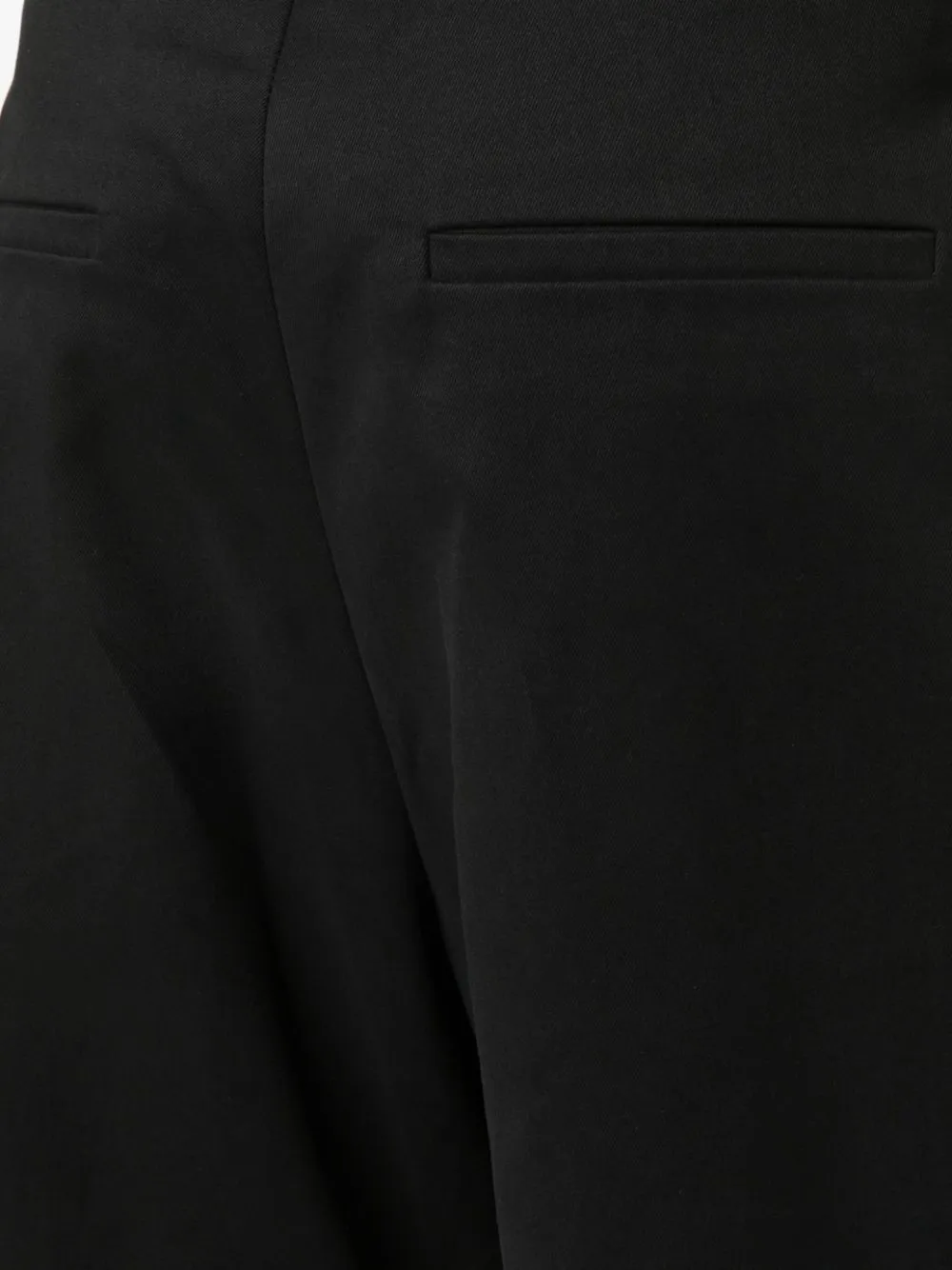 Черный, хлопок, завышенная талия, широкий крой, складки, потайная застежка спереди, два прорезных кармана по бокам и два кармана с листочкой сзади.