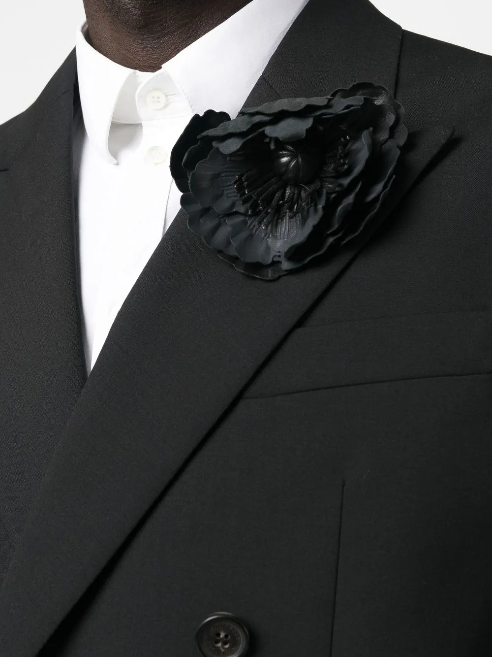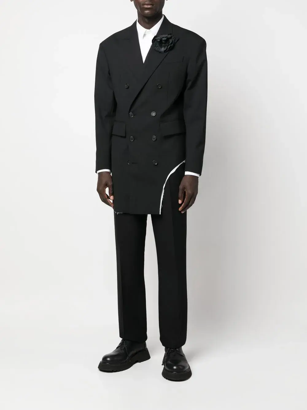 Черный, смесовая необработанная шерсть, хлопок, цветочная аппликация, вырезные детали, двубортная застежка на кнопки, манжеты на пуговицах, широкие заостренные лацканы, два передних кармана с клапанами и асимметричный подол.